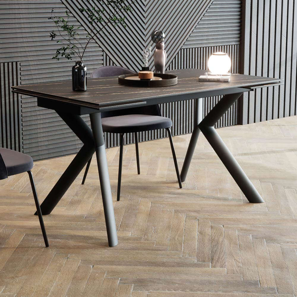 Uitschuifbare eettafel met antraciet gelakte metalen structuur en blad van porselein aardewerk in de sahara noir afwerking. Een solide en resistent product gekenmerkt door een exclusief en modern design, ideaal voor liefhebbers van een essentiële en veelzijdige stijl, in staat om de inrichting van hun eetkamer of keuken te vervolledigen met elegantie en persoonlijkheid. Dankzij de prachtige combinatie van materialen en afwerkingen is het de ideale oplossing voor diegenen die een functioneel product nodig hebben, maar tegelijkertijd een grote visuele impact hebben .