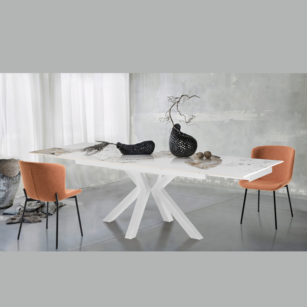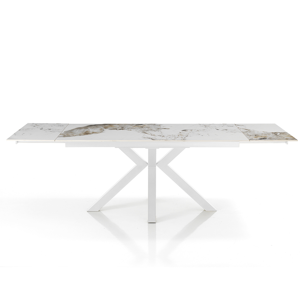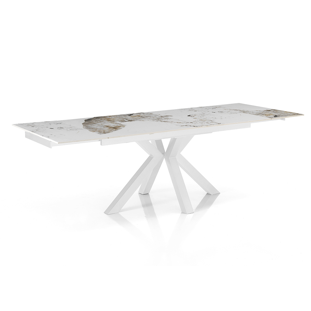 Deze uitschuifbare tafel is een meesterwerk van eigentijds design en combineert elegantie en functionaliteit in één enkel luxe meubelstuk. Het tafelblad, gemaakt van keramiek met marmereffect, wordt gekenmerkt door ingewikkelde nerven die elk stuk een uniek karakter en persoonlijkheid geven.