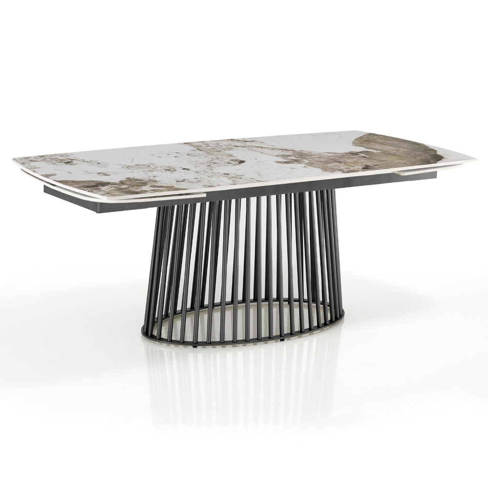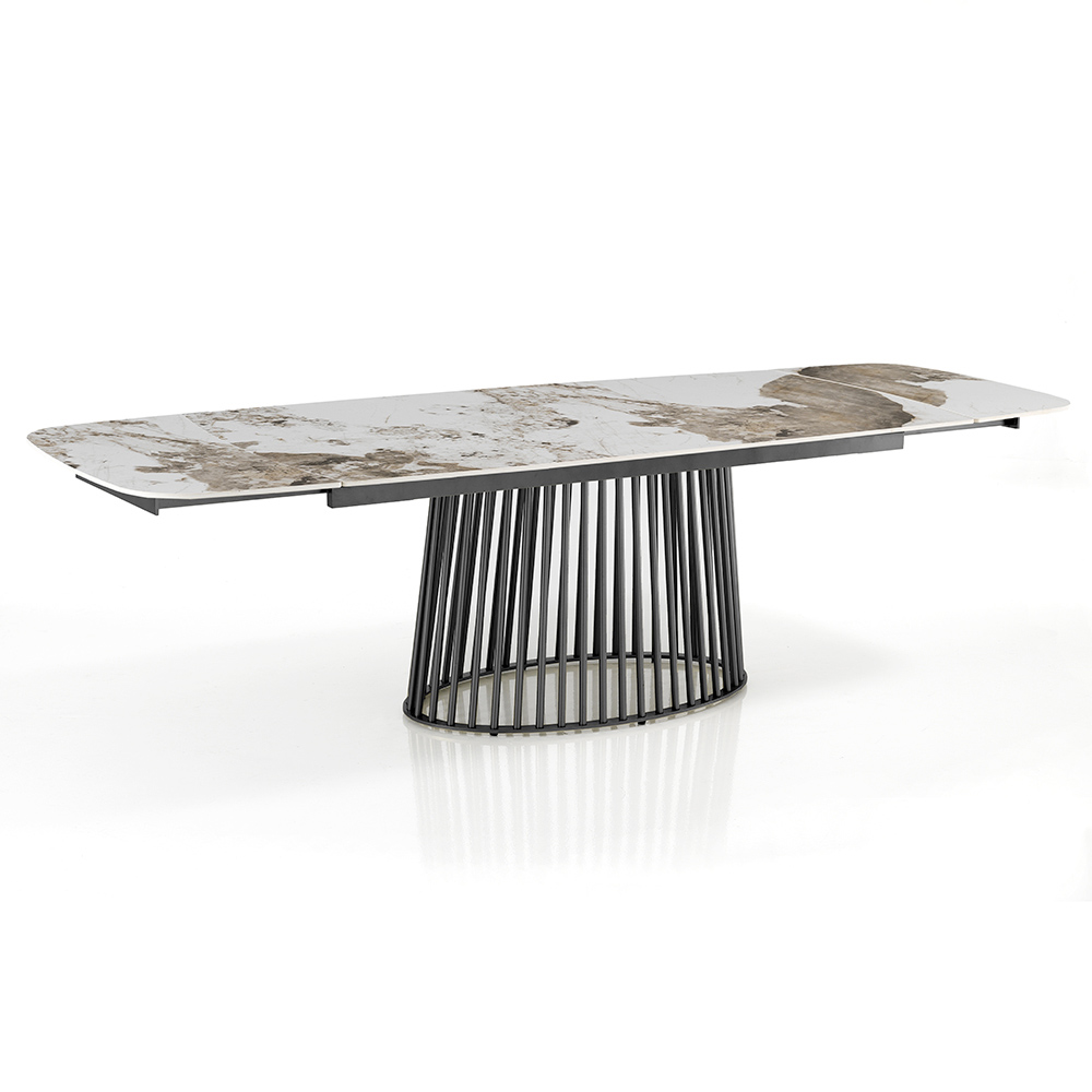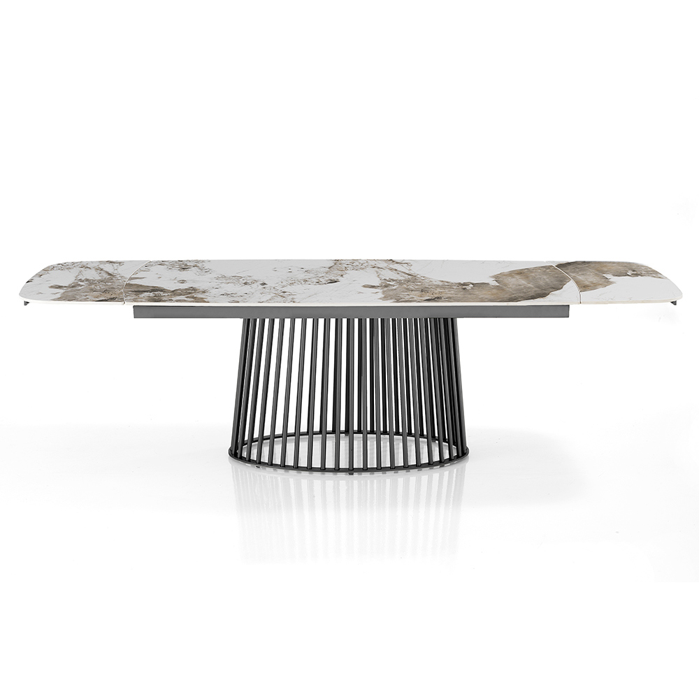 Ondersteund door een metalen onderstel met een ingewikkeld geribbeld ontwerp, combineert deze tafel stevigheid en sculpturale stijl . De mogelijkheid om te strekken biedt uitzonderlijke veelzijdigheid en past perfect bij zowel intieme diners als grote bijeenkomsten, zodat elke gelegenheid met elegantie wordt gehost.