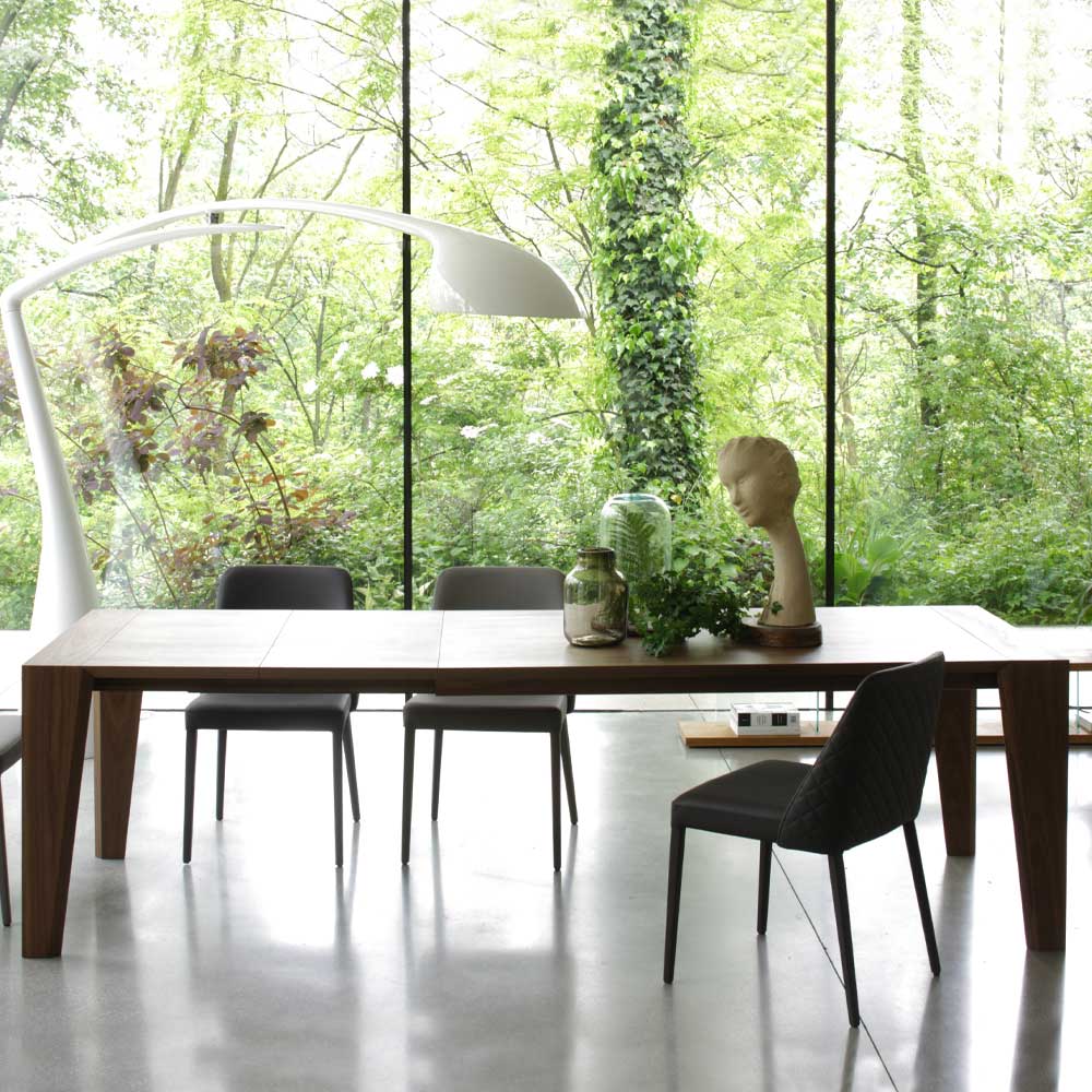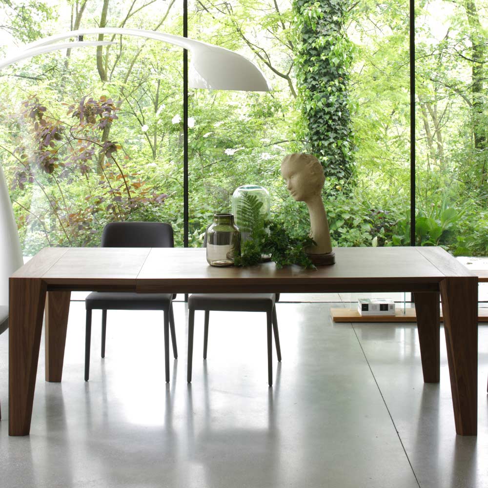 gemaakt in Italië. De tafel drukt de essentie van de natuur uit door de Canaletto walnootafwerking, die zowel op het blad als op de poten aanwezig is. Dit imposante en verfijnde meubelstuk biedt veelzijdigheid dankzij zijn uitschuifbare functie, waardoor u kunt kiezen tussen een versie met één of twee verlengstukken. Het schuifmechanisme, dat zelfs zichtbaar is als de tafel is uitgeschoven, behoudt een samenhangend ontwerp, waarbij esthetiek en functionaliteit worden gecombineerd. Het is meer dan alleen een eettafel, het is een kunstwerk dat de schoonheid van de natuur in uw ruimte viert.