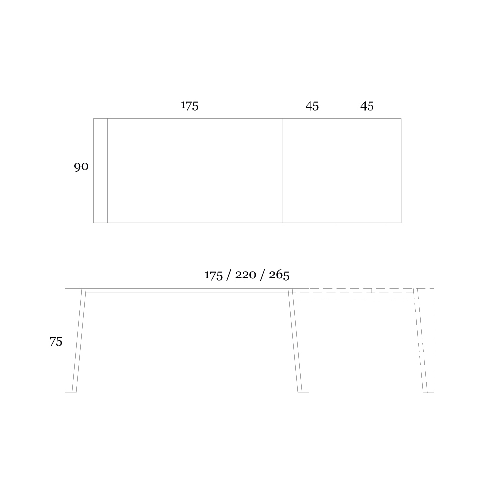 - lengte: 175/220/265 cm x diepte: 90 cm x hoogte: 75 cm - 2 verlengstukken