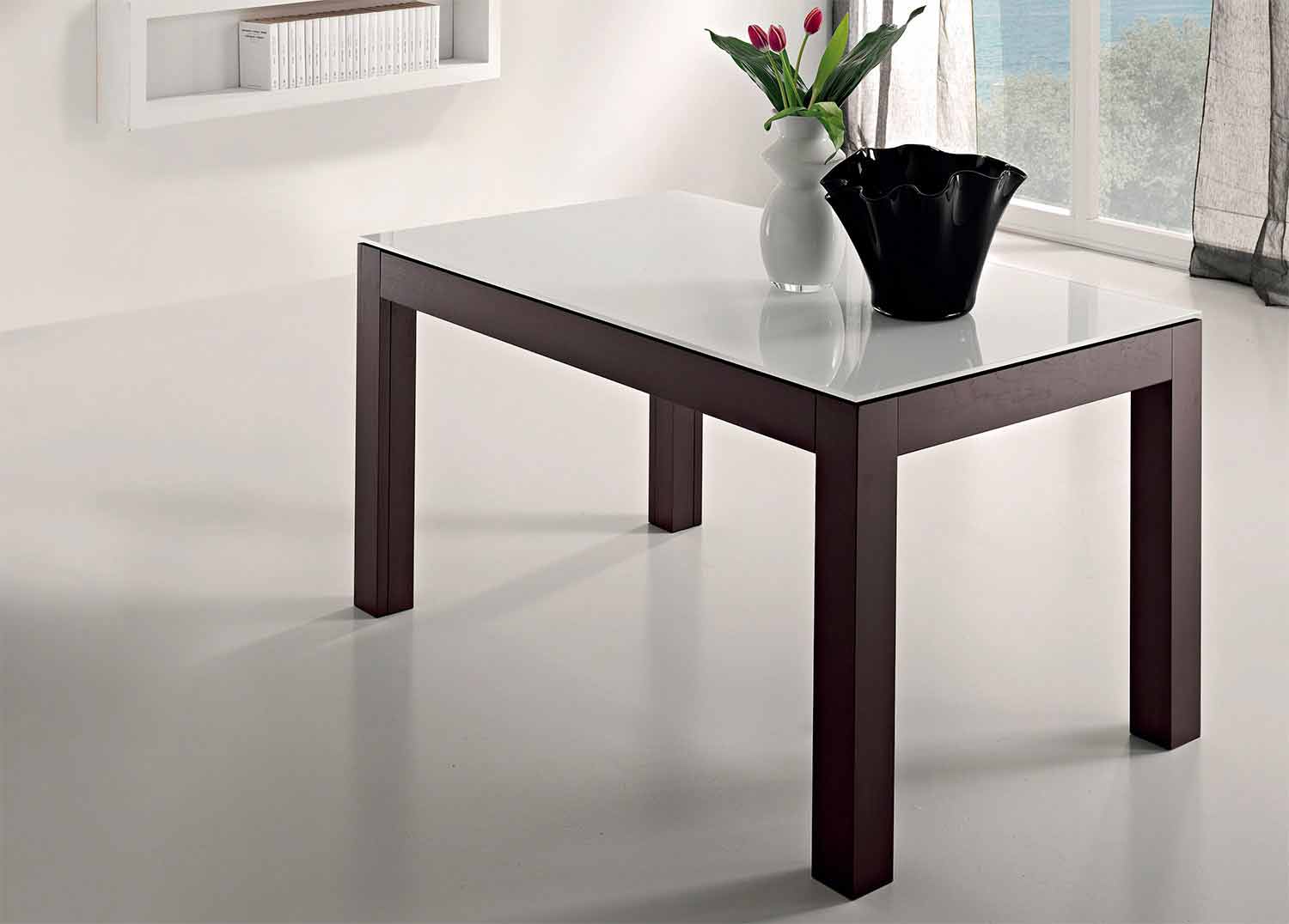 extra helder melkglazen blad (10 mm dik). Het blad wordt uitschuifbaar door een zijopening met houten geleiders; binnen zijn er 2 planken van elk 60 cm voor de 150 cm lange tafel en 2 planken van elk 50 cm voor de 130 cm lange tafel. De planken (