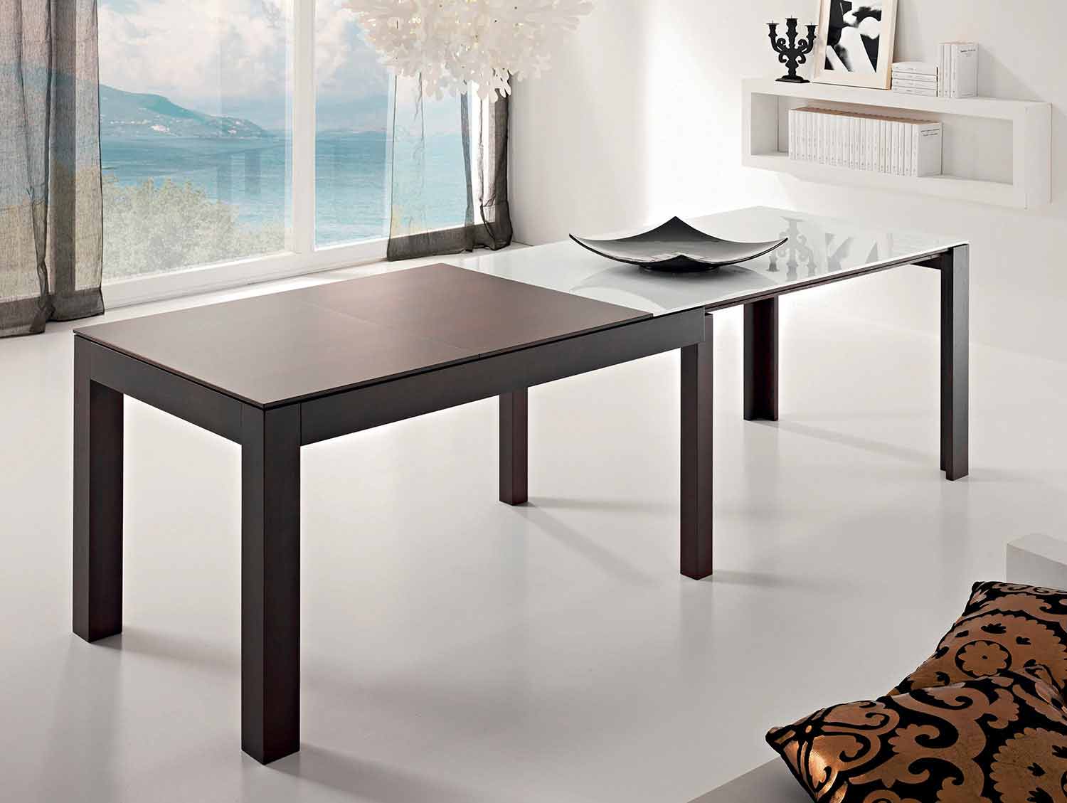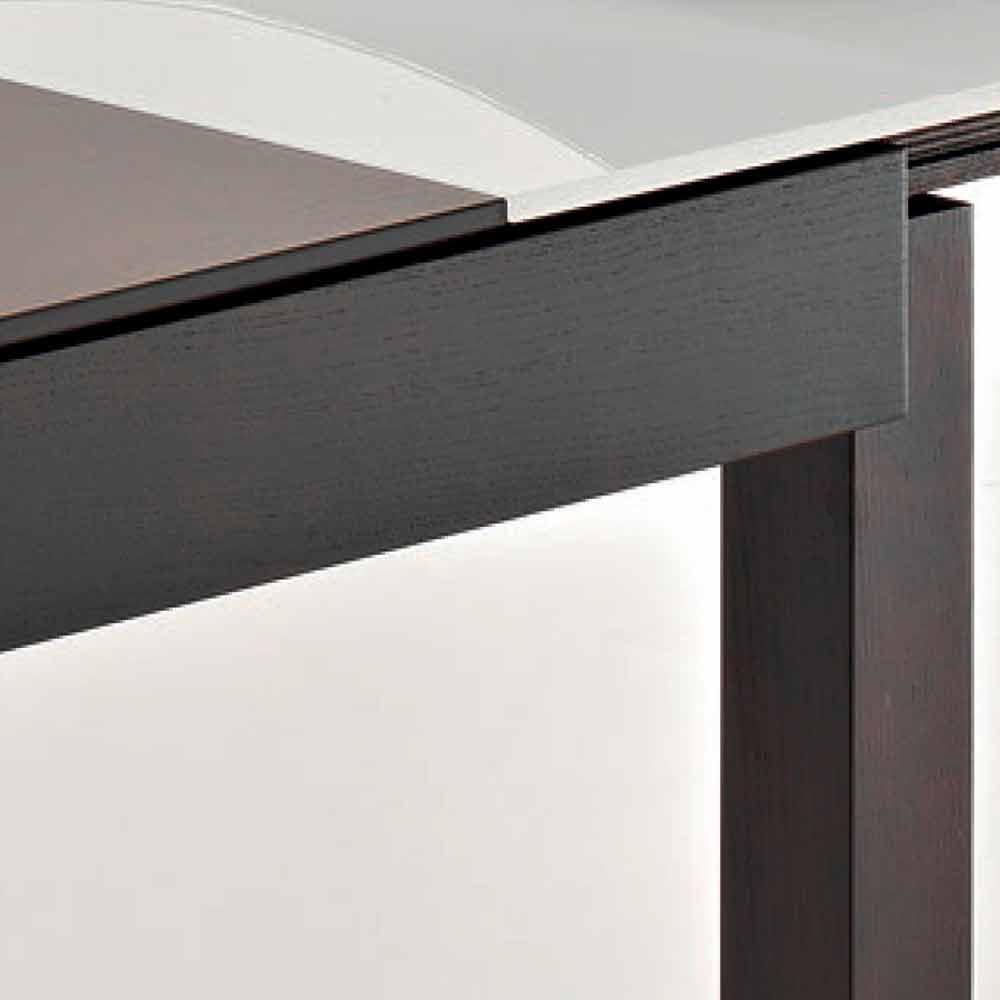 Modern design uitschuifbare eettafel met extra helder melkglazen blad en essenhouten voet, gemaakt in Italië.