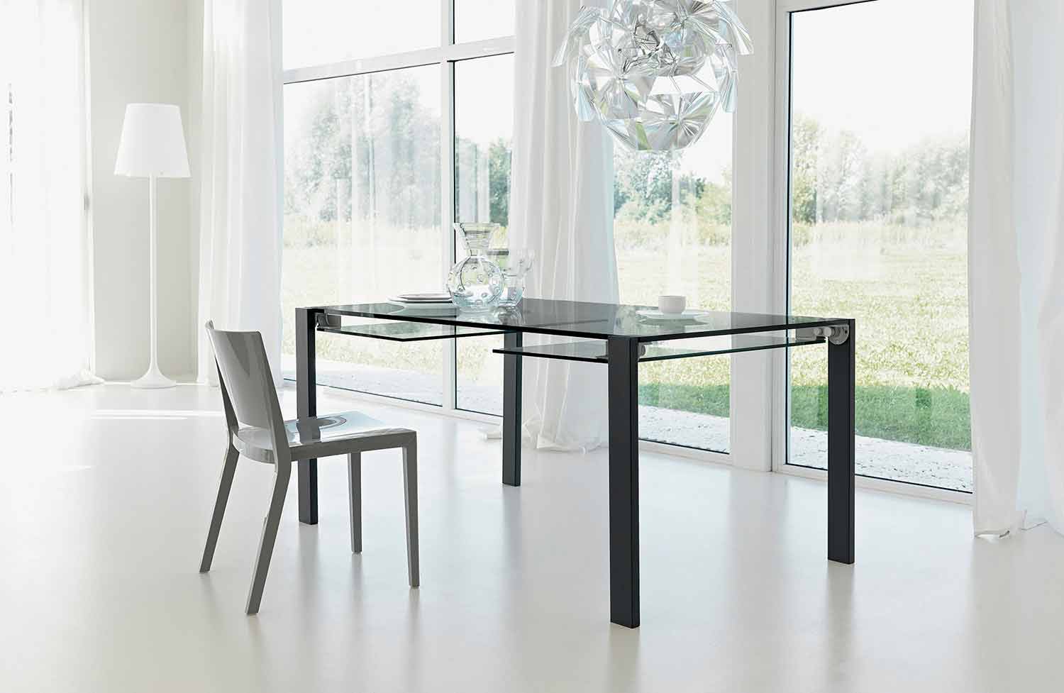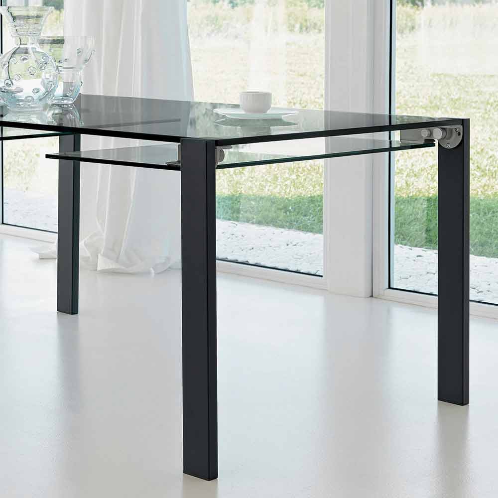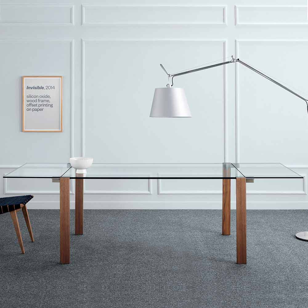 Transparant glazen tafel uitschuifbaar tot 12 plaatsen met metalen of canaletto walnoot onderstel, made in Italy.