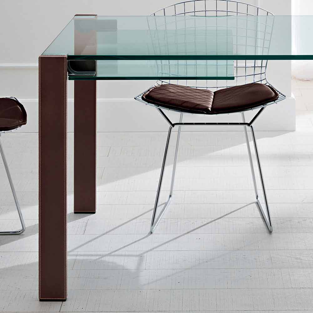 - blad en verlengstukken in transparant glas, metalen poten bedekt met donkerbruin leer;