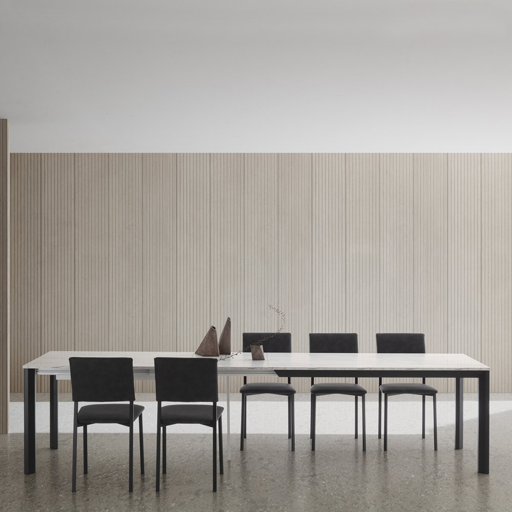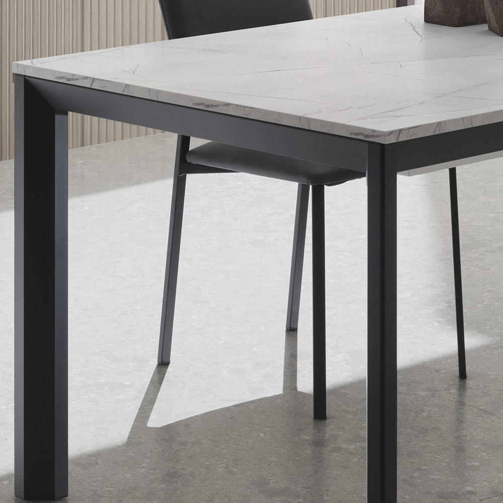 Uitschuifbare eettafel met aluminium onderstel en HPL blad Made in Italy.