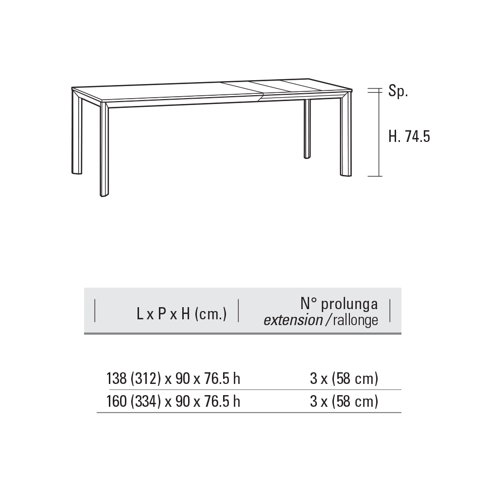 drie verlengstukken van elk 58 cm Ze zijn gemaakt van hetzelfde materiaal als het blad en zorgen ervoor dat dit meubelelement kan worden uitgetrokken tot een maximale lengte van 334 cm, waardoor een