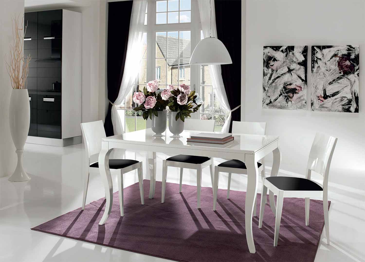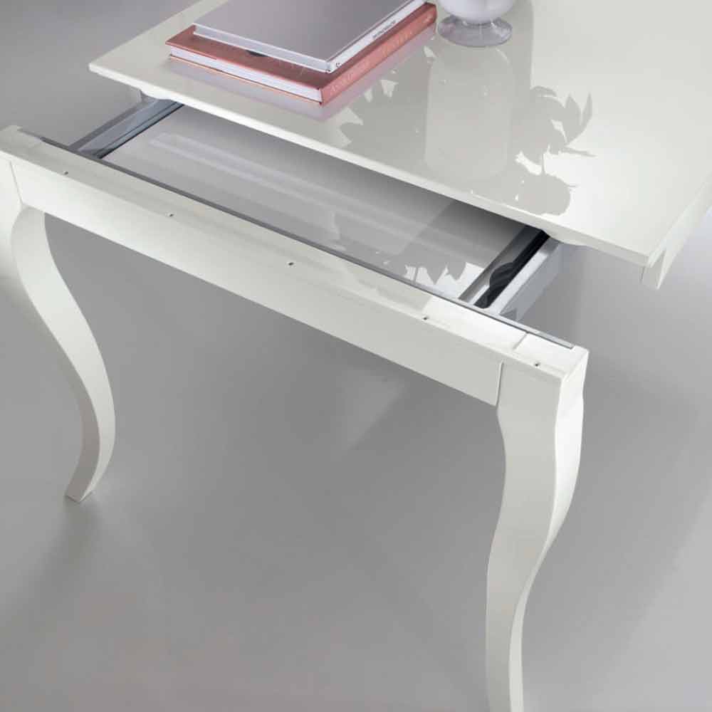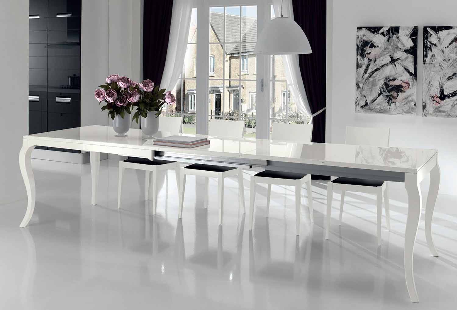 Uitschuifbare eettafel tot 350 cm met glanzend wit Tanganyika walnoot gefineerd houten blad en massief beukenhouten onderstel, gemaakt in Italië.
