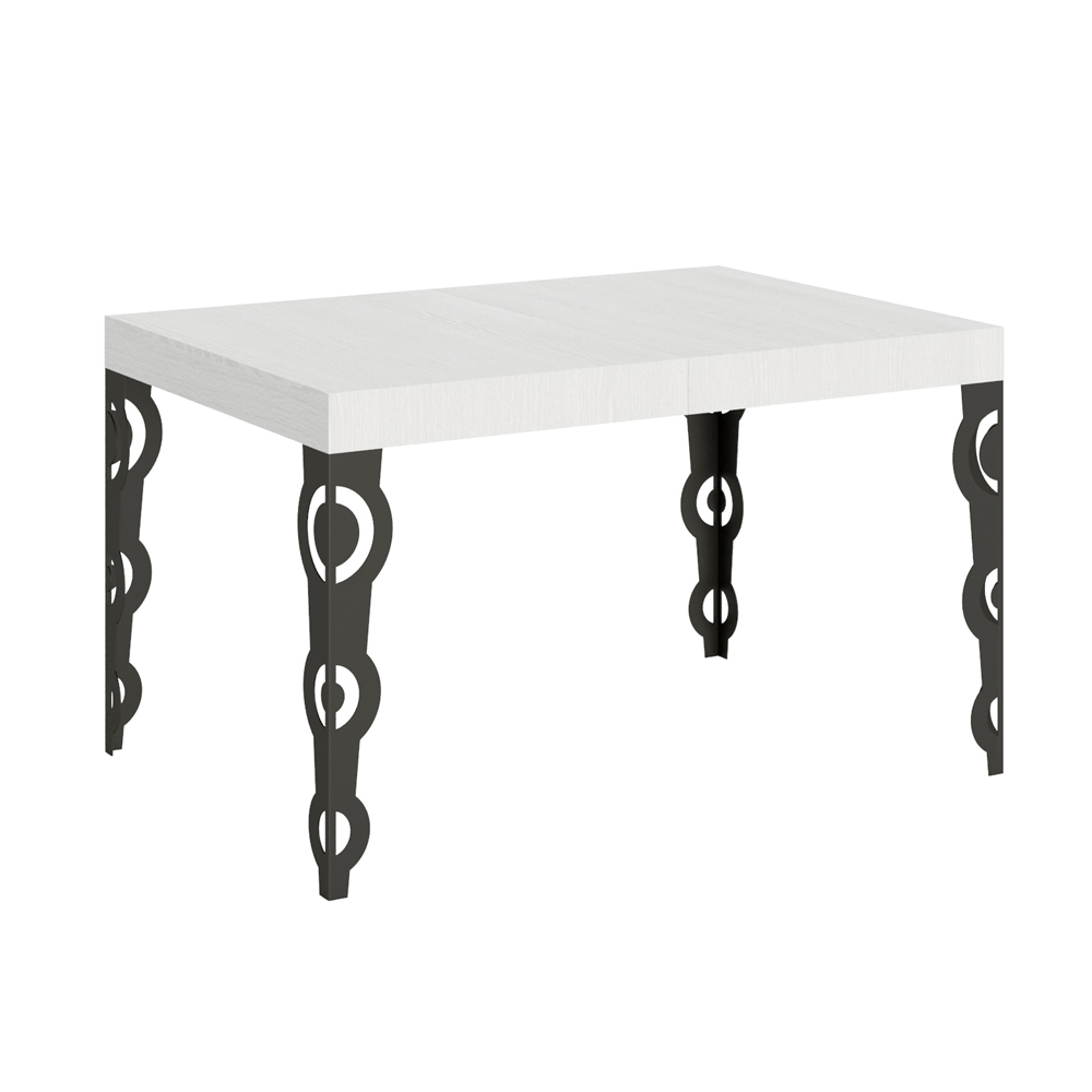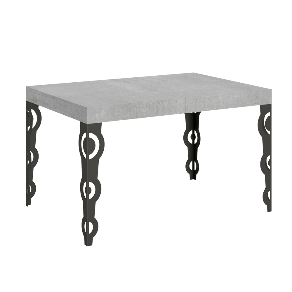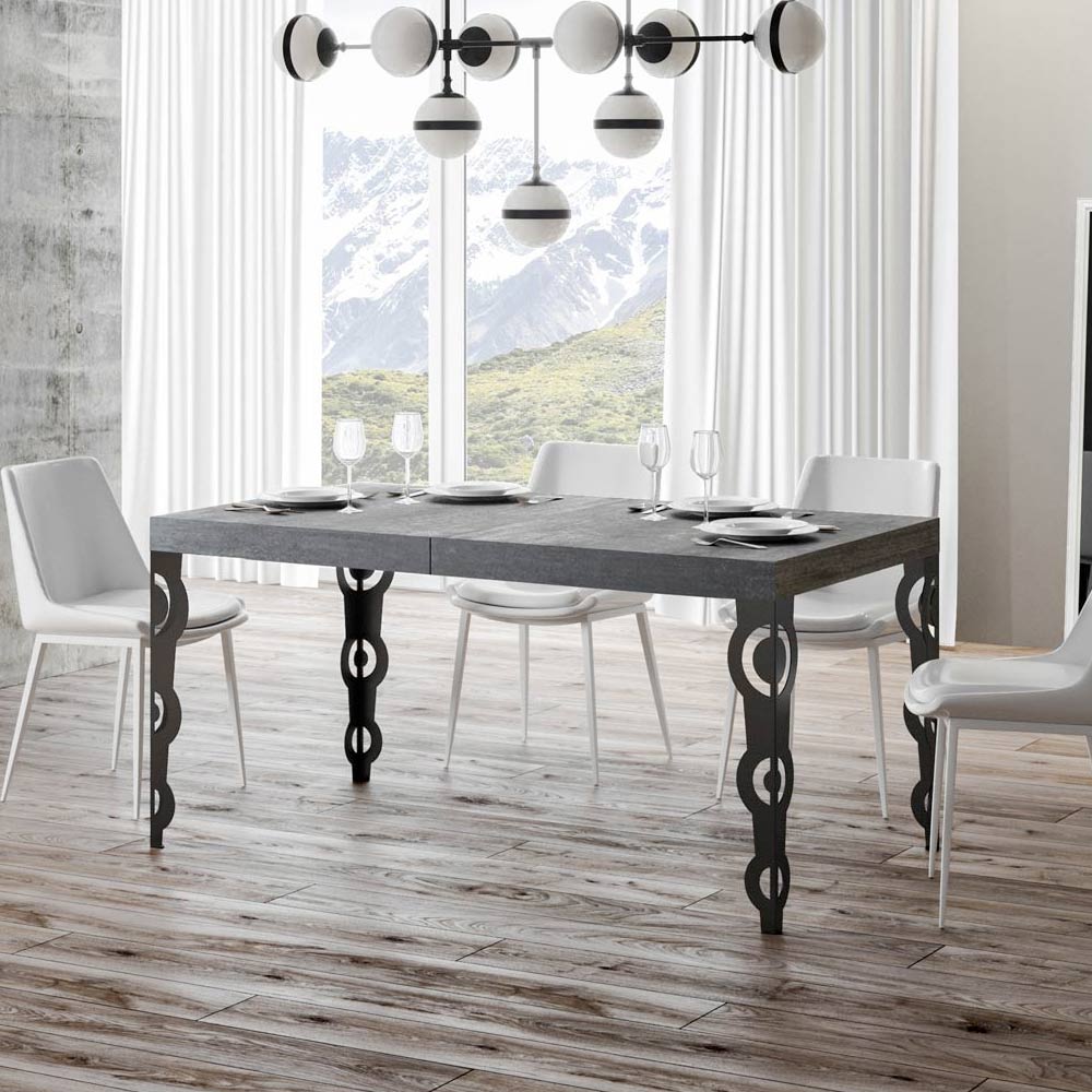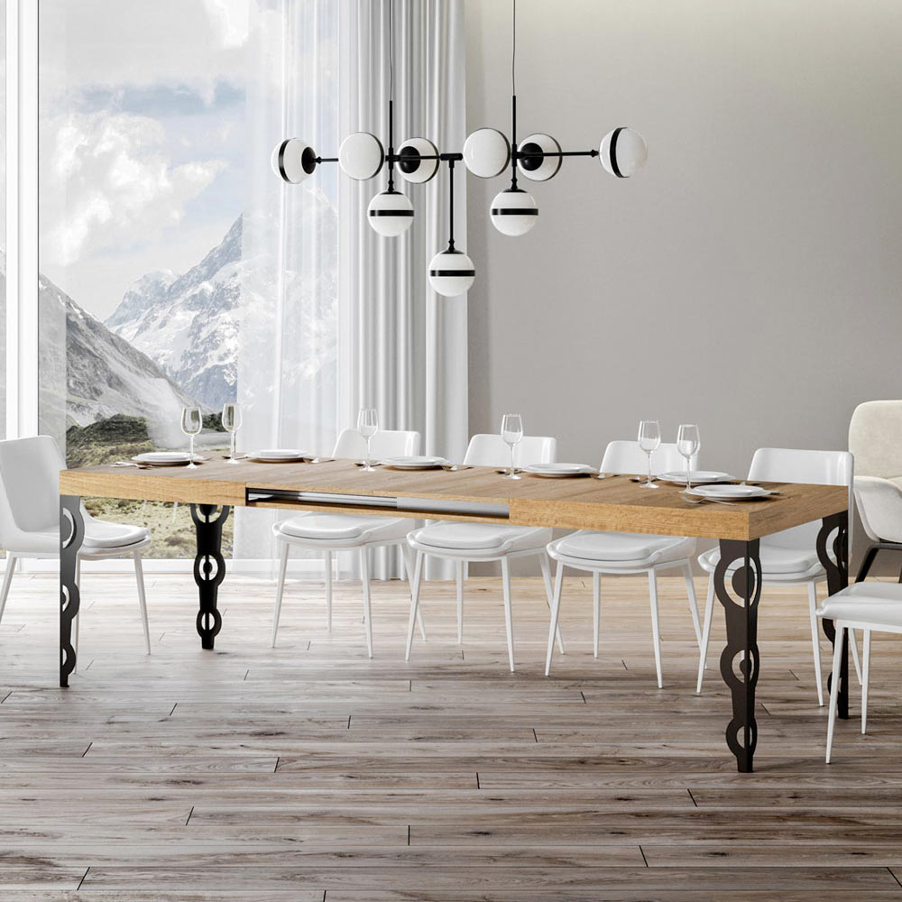 Deze uitschuifbare tafel mengt de 'oude charme van sierlijk design met moderne functionaliteit. De gesneden ijzeren poten zijn voorzien van ingewikkelde barokke patronen, een detail dat zeker in het oog springt.