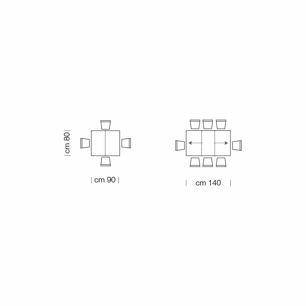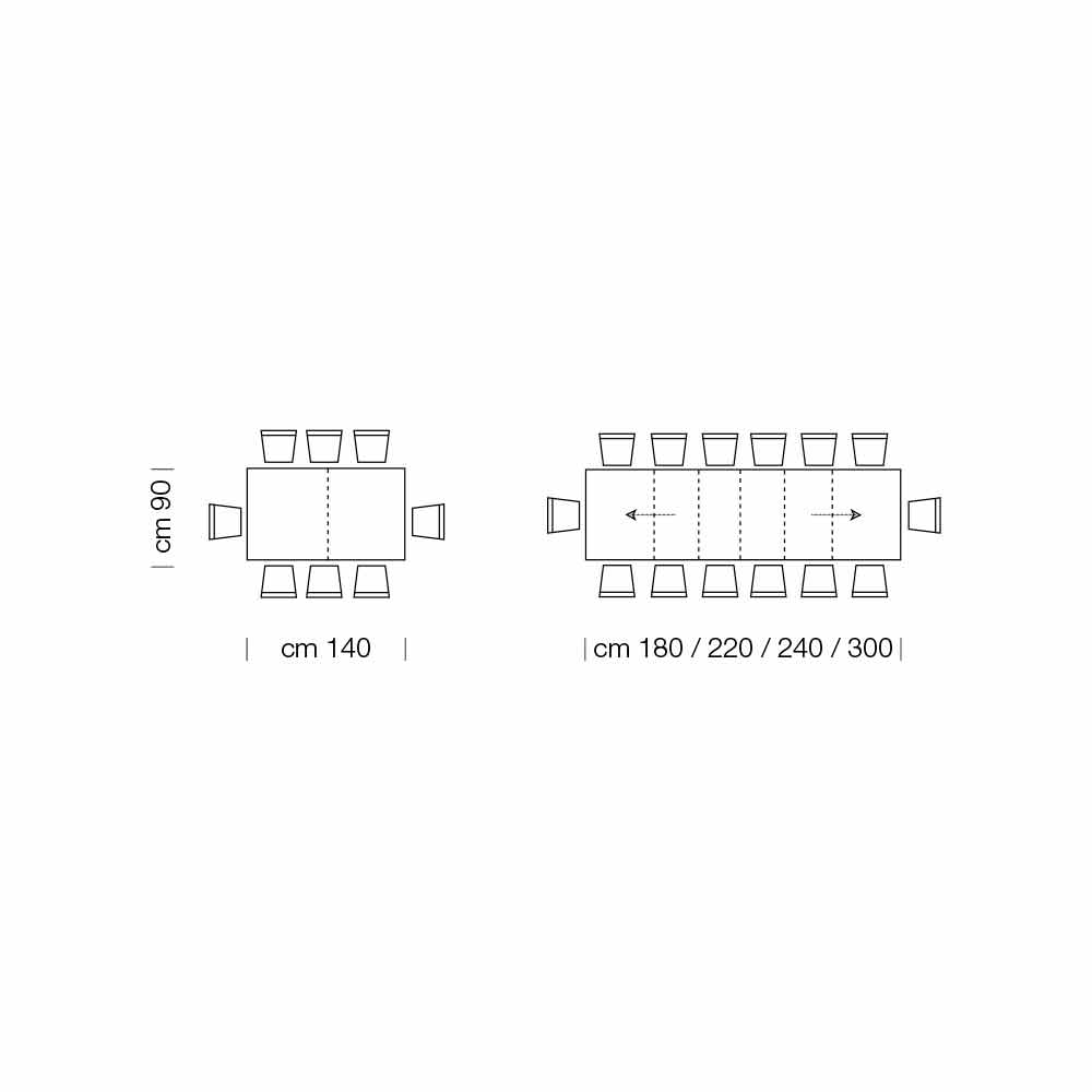 - L 140 (300) x D 90 x H 77 cm 14-zits uitschuifbaar met vier interne verlengstukken van 40 cm;