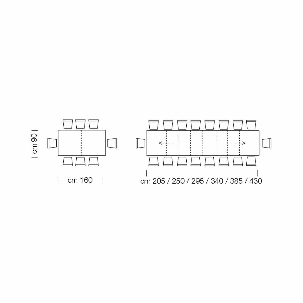- L 160 (430) x D 90 x H 77 cm 18-zits uitschuifbaar met zes verlengstukken van 45 cm, drie interne en drie geleverd in een herbruikbare kartonnen doos;
