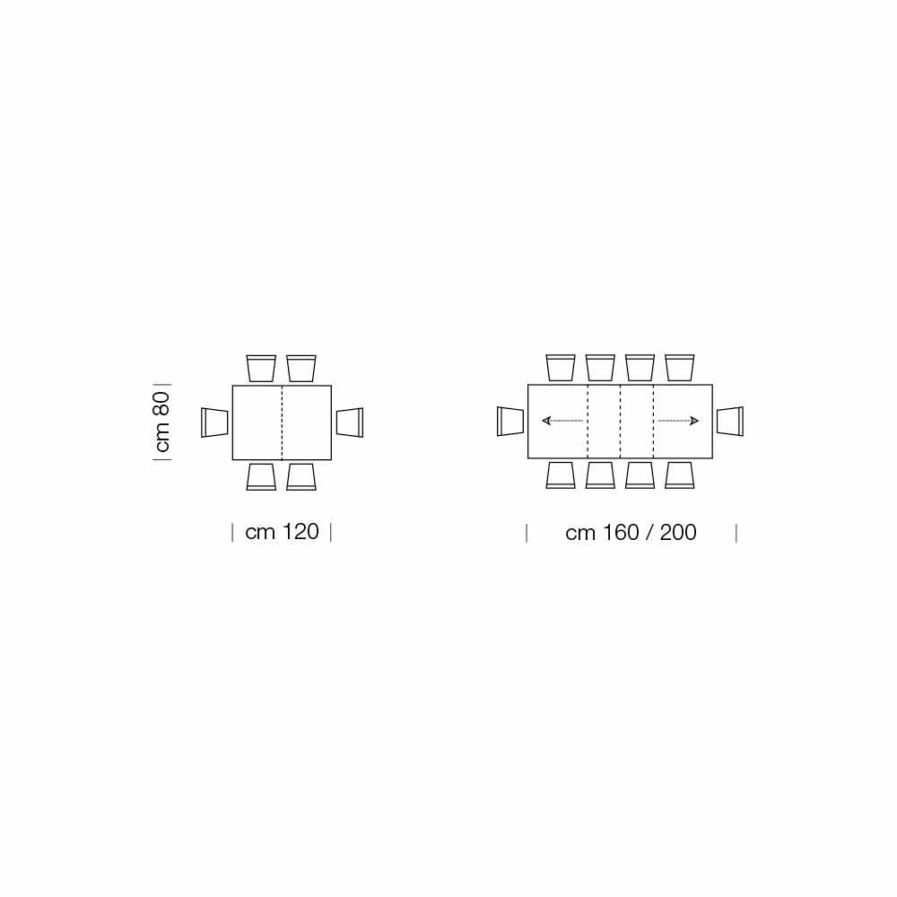 - L 120 (200) x D 80 x H 77 cm 10-zits uitschuifbaar met twee interne verlengstukken van 40 cm;