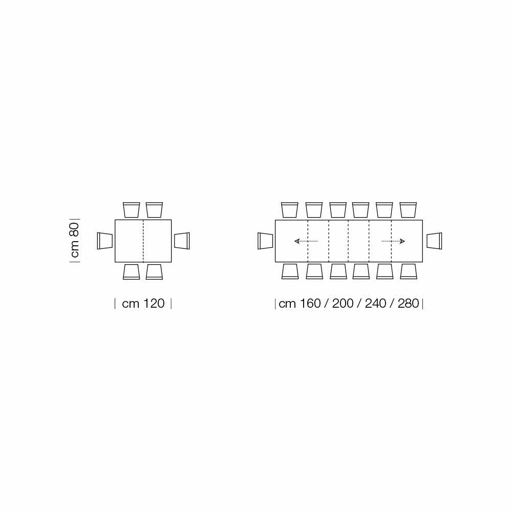 - L 120 (280) x D 80 x H 77 cm 14-zits uitschuifbaar met vier interne verlengstukken van 40 cm;