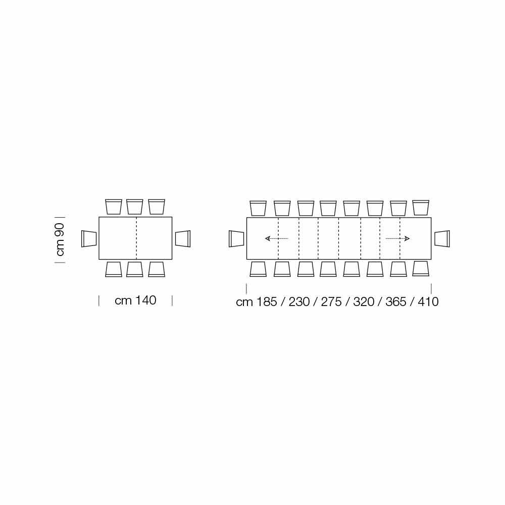 - L 140 (410) x D 90 x H 77 cm 18-zits uitschuifbaar met zes verlengstukken van 45 cm, drie interne en drie geleverd in een herbruikbare kartonnen doos;