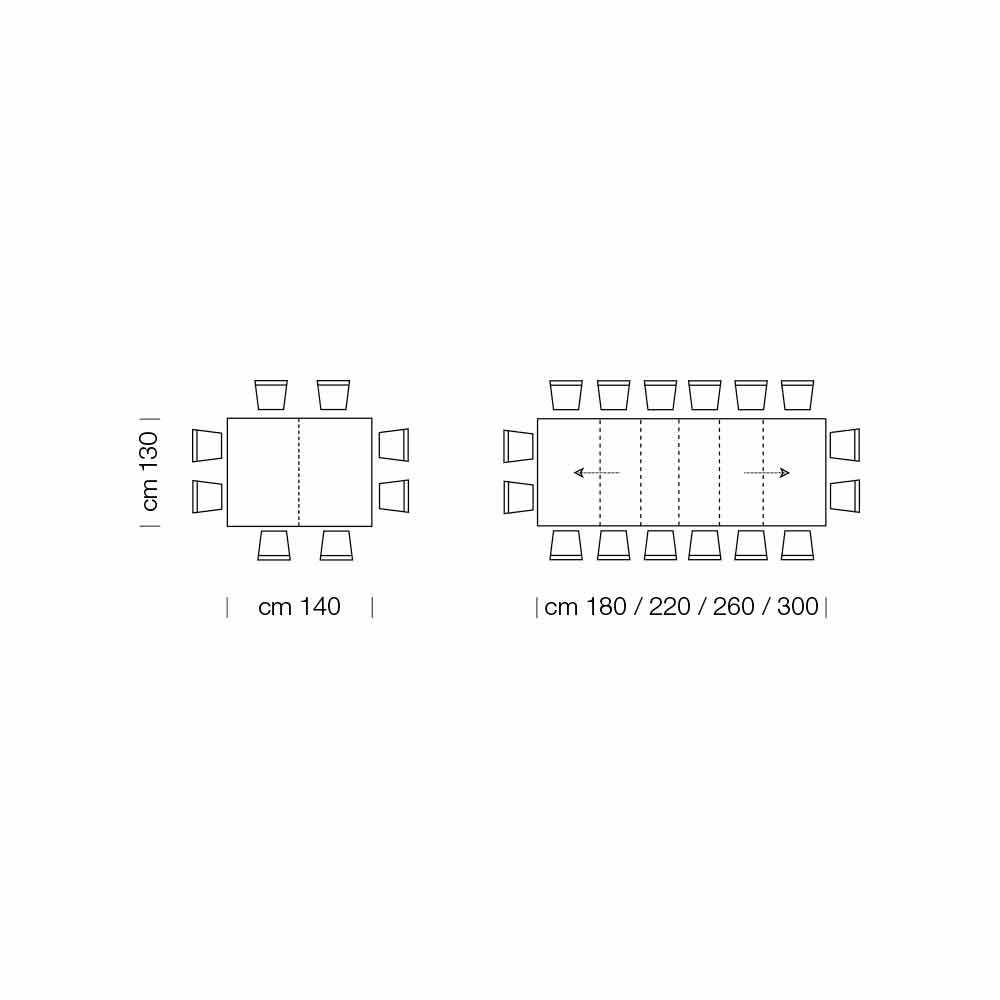 - L 140 (300) x D 130 x H 77 cm 16-zits uitschuifbaar met vier interne verlengstukken van 40 cm;