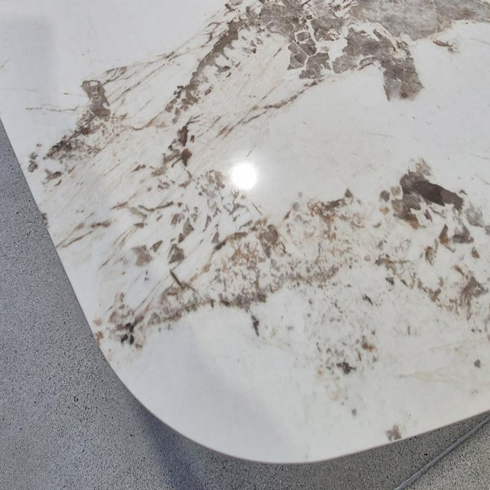 Deze tafel van steengoed en metaal combineert modern design en trendy materialen tot een visueel opvallend meubelstuk. Het steengoedblad met marmereffect , met zijn natuurlijke nerfstructuur en glanzende afwerking, geeft elke ruimte een verfijnde, eigentijdse elegantie. Het gevlochten metalen onderstel , met zijn vloeiende, dynamische vormen, vormt het ware sculpturale element van de tafel: solide en toch golvend, geeft het de hele structuur balans en persoonlijkheid.