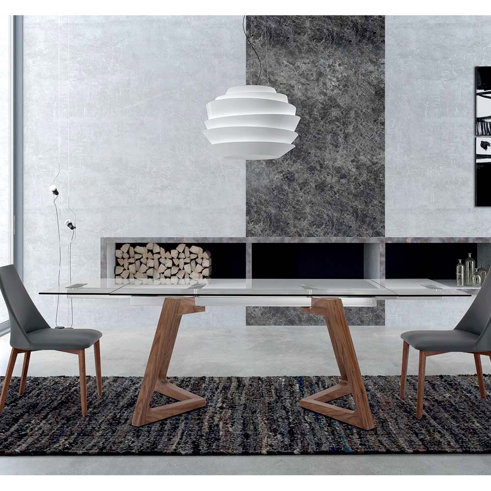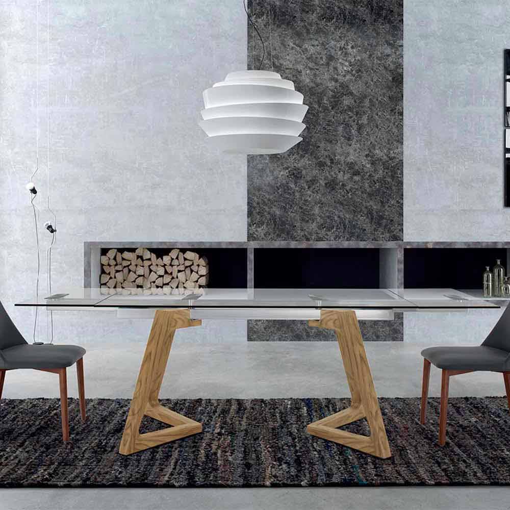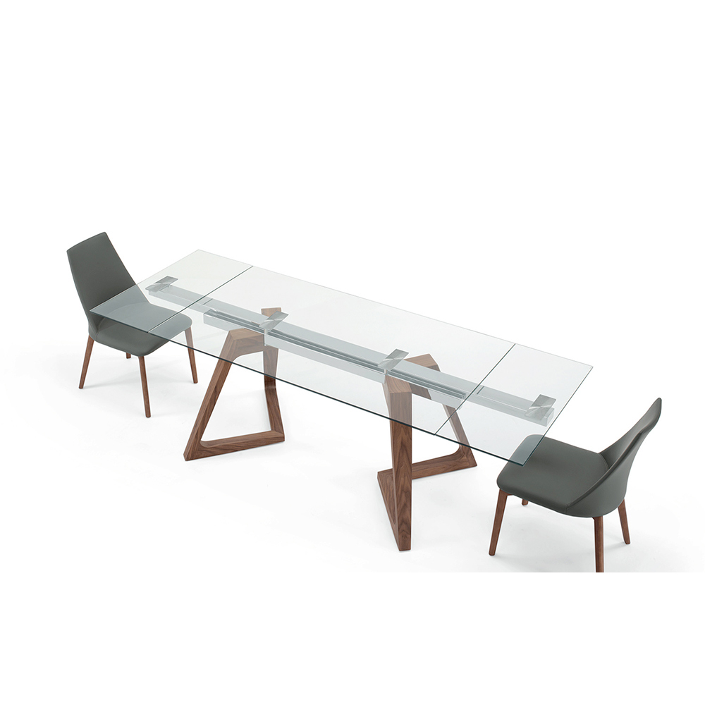 Modern design uitschuifbare houtfineer tafel tot 280 cm met transparant glazen blad.