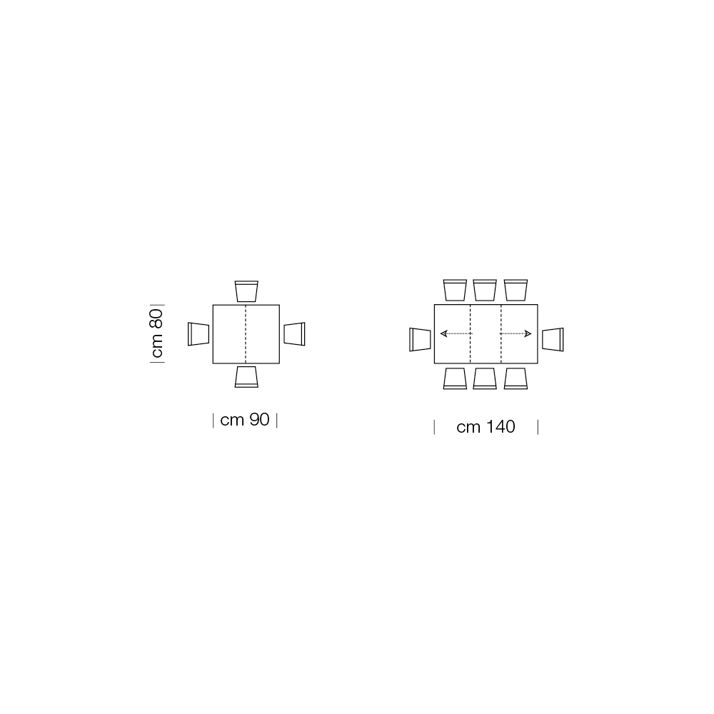 Maatregelen- L 90 (140) x D 80 x H 77 cm 8 zitplaatsen uitschuifbaar met een interne verlenging van 50 cm;