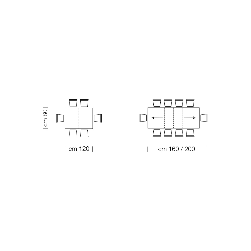 - L 120 (200) x D 80 x H 77 cm 10-zits uitschuifbaar met twee interne verlengstukken van 40 cm;