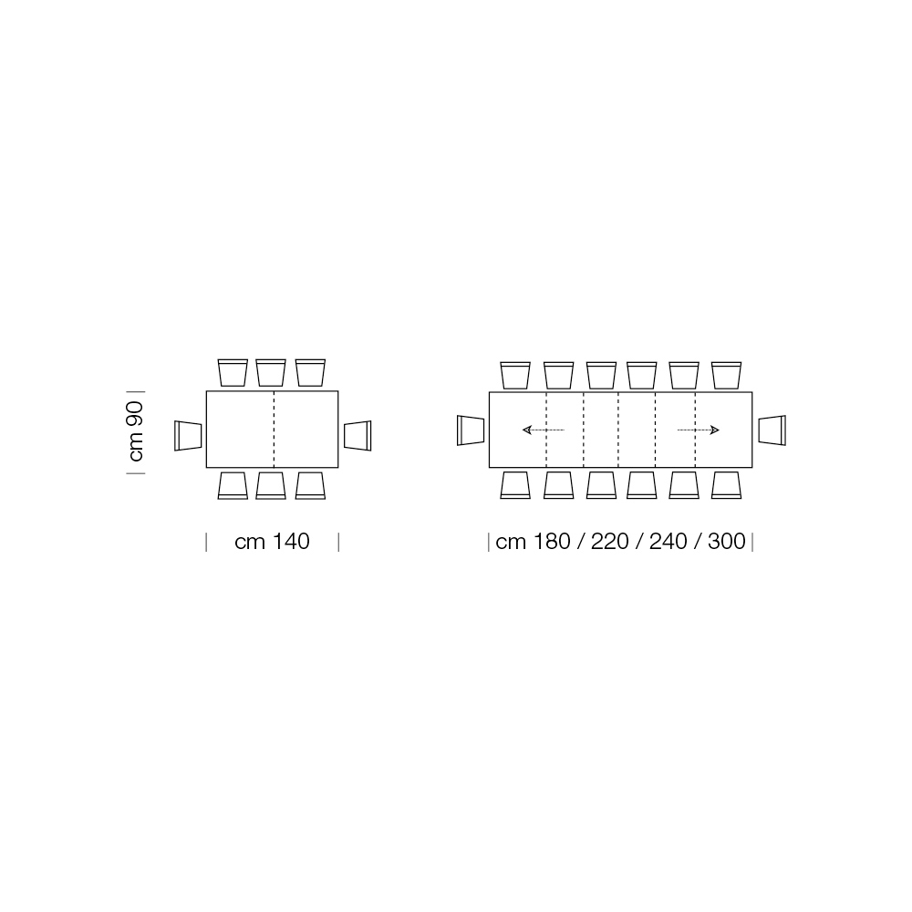 - L 140 (300) x D 90 x H 77 cm 14-zits uitschuifbaar met vier interne verlengstukken van 40 cm;