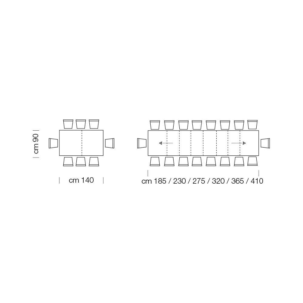 - L 140 (410) x D 90 x H 77 cm 18-zits uitschuifbaar met zes verlengstukken van 45 cm, drie interne en drie geleverd in een herbruikbare kartonnen doos;