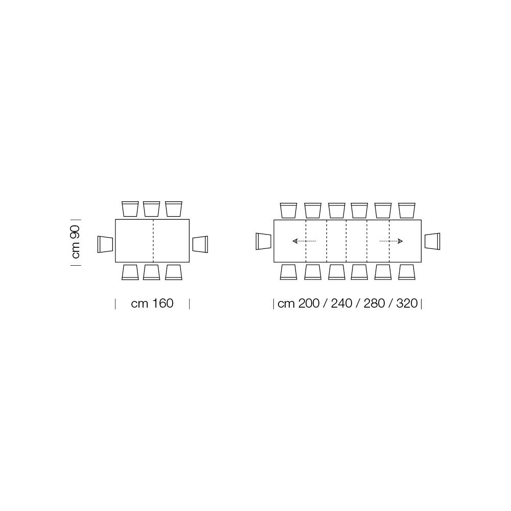 - L 160 (320) x D 90 x H 77 cm 14-zits uitschuifbaar met vier interne verlengstukken van 40 cm;