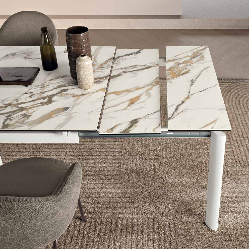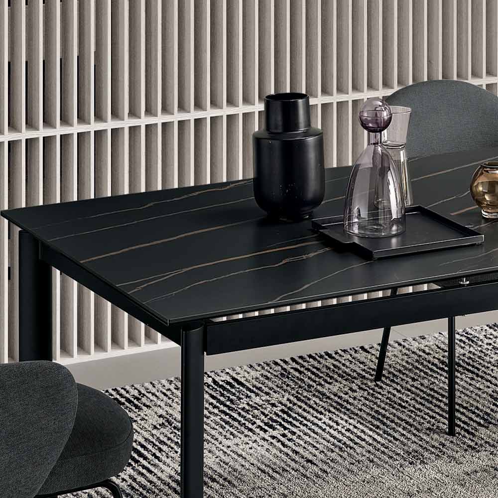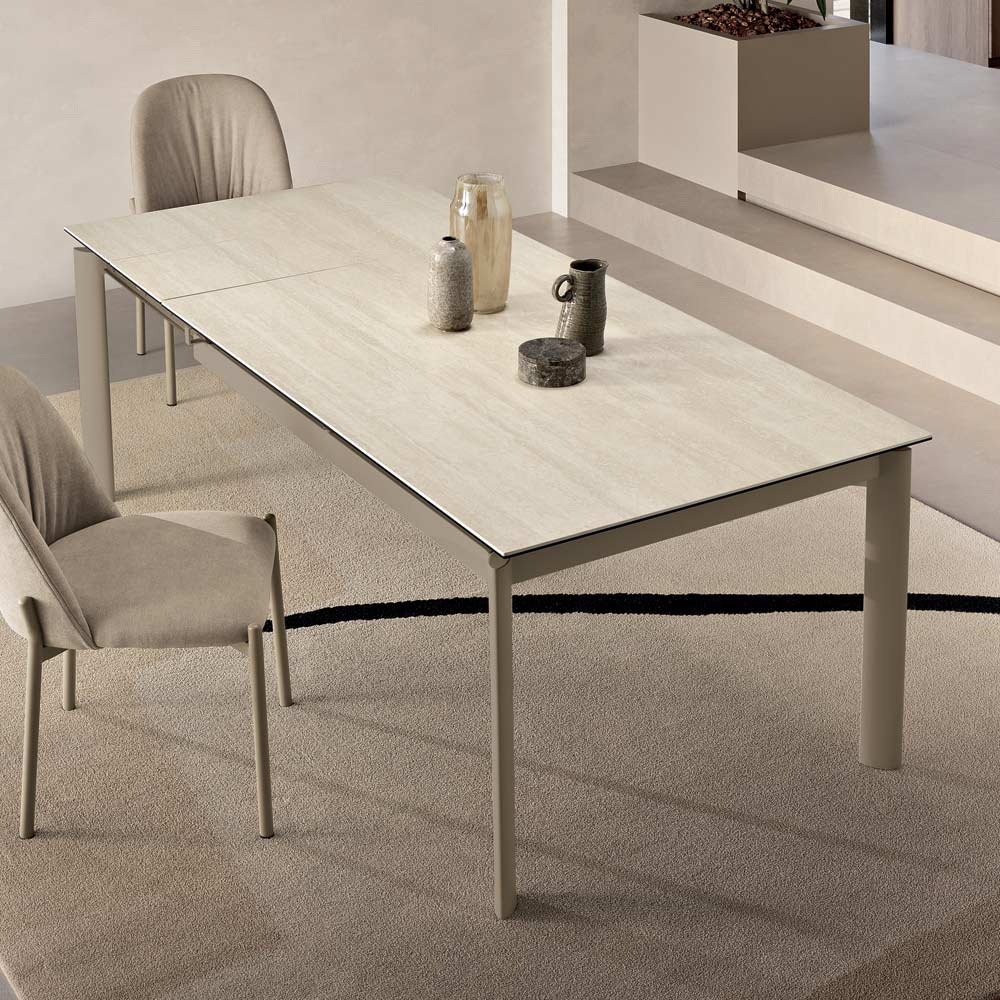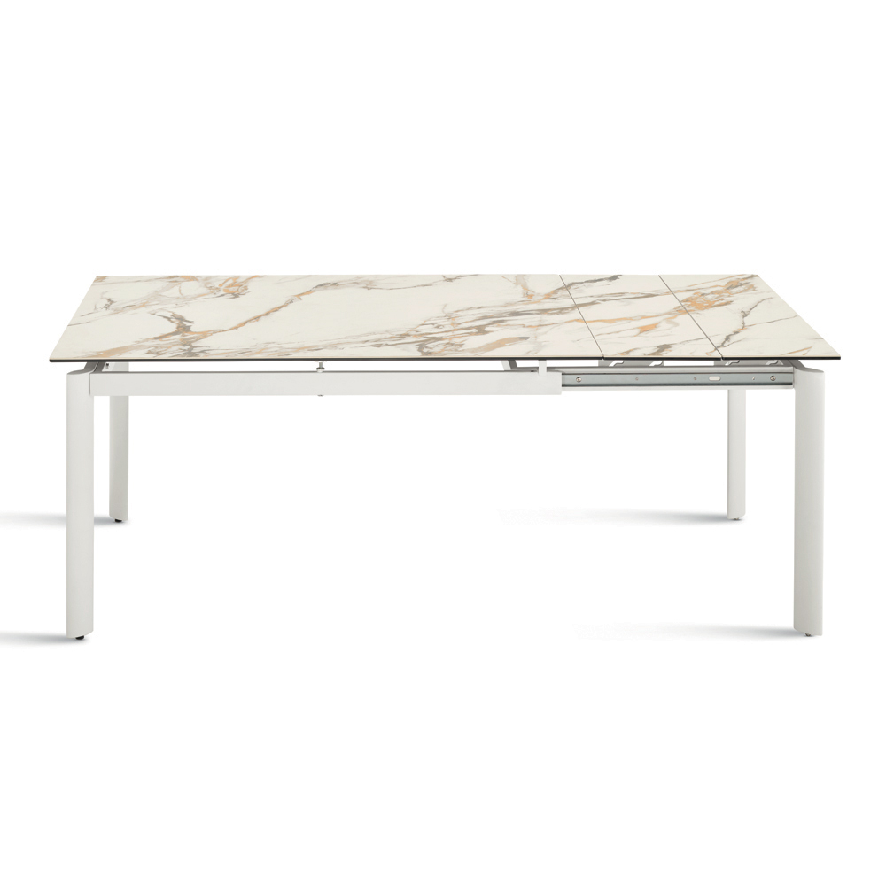 Een elegante uitschuifbare tafel met een minimalistisch design, ideaal om een stijlvolle touch aan uw eetkamer of woonkamer te geven. Het gelakte metalen frame ondersteunt een verfijnd blad van porselein met marmerlook , ontworpen voor praktisch en veelzijdig dagelijks gebruik.
