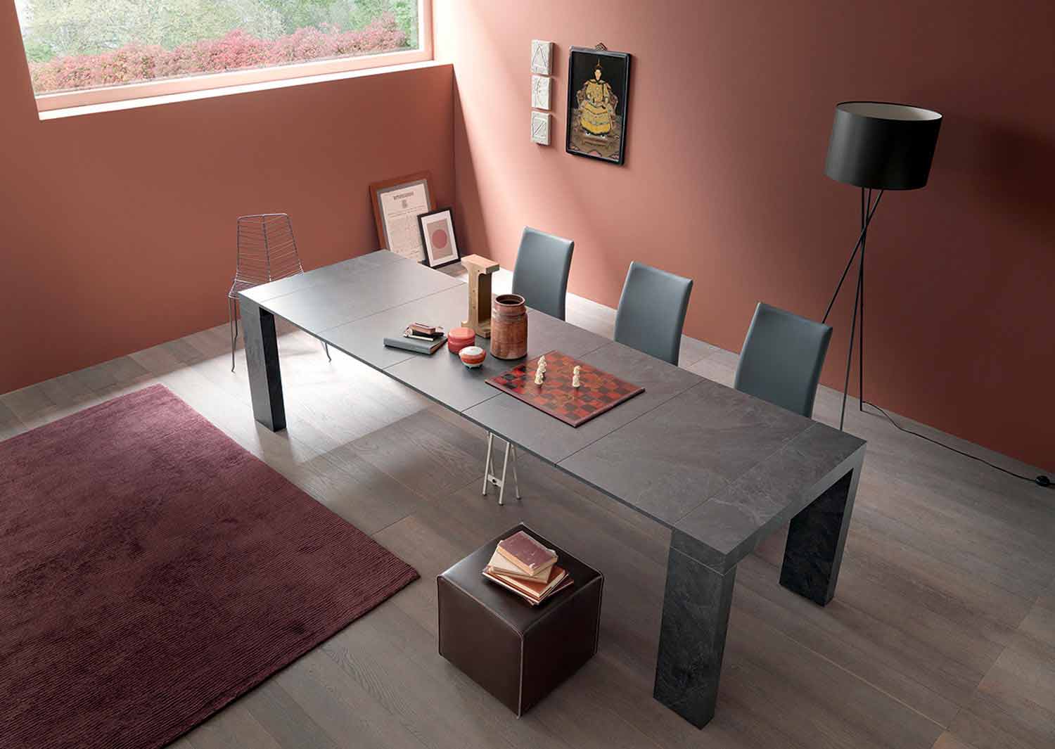 uitschuifbare console wordt geschetst door een belangrijk en monumentaal ontwerp dat op een schilderachtige en functionele manier de hoofdrolspeler van de kamer wordt.