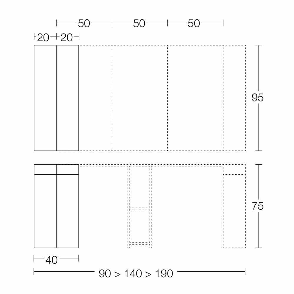 - Console: L 95 x D 40 x H 75 cm; Tafel B 90/140/190/240/290 x D 95 x H 75 cm