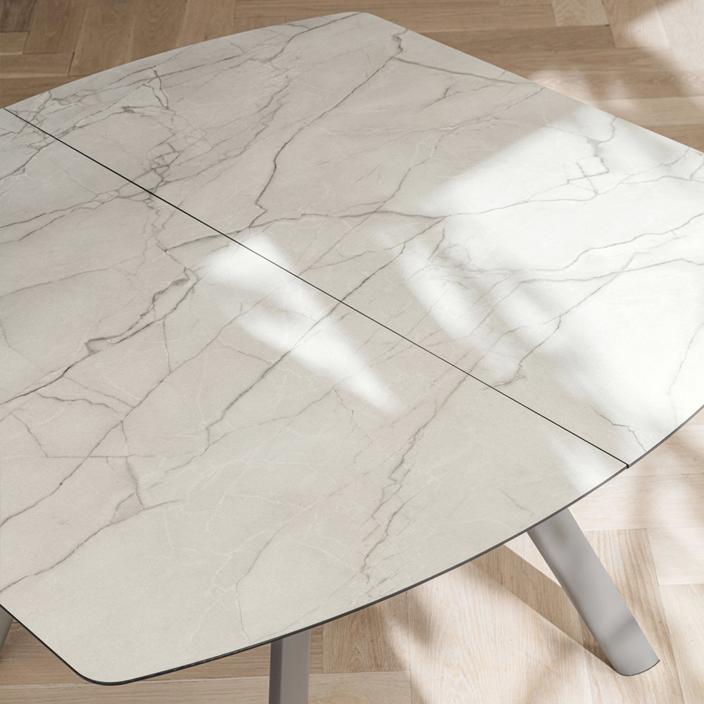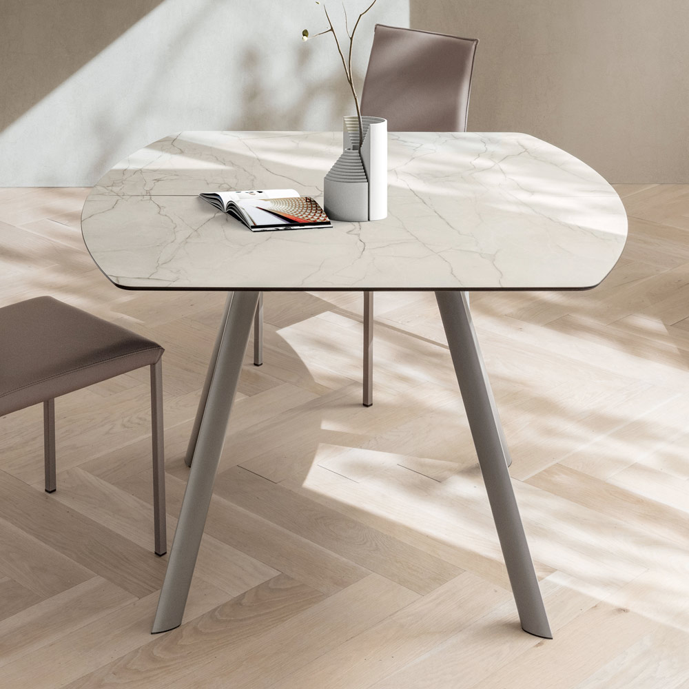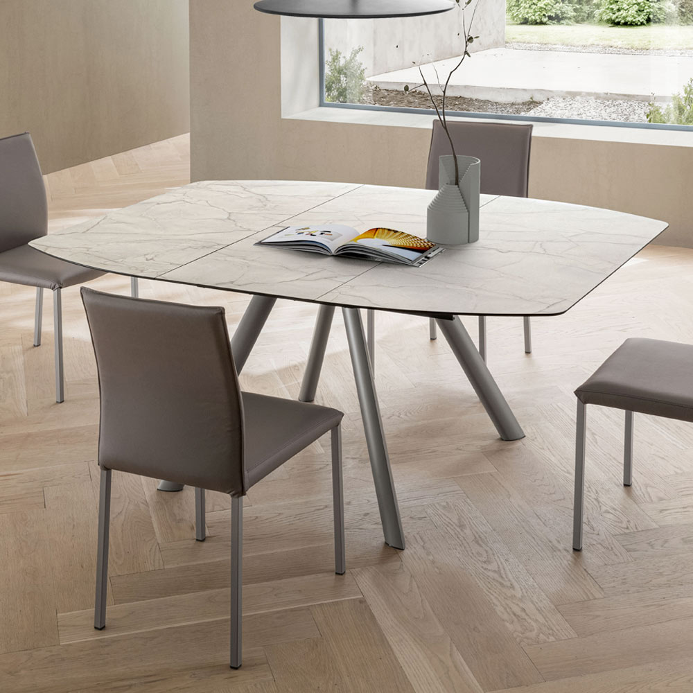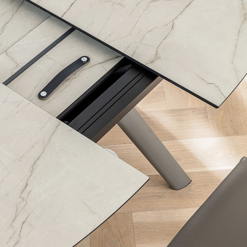 Het HPL- blad voegt helderheid en verfijning toe aan de omgeving en doet denken aan de aderen van de steen met een robuust oppervlak. Dankzij het centrale uitschuifsysteem is de tafel eenvoudig uit te schuiven en biedt zo extra ruimte voor gasten of familielunches. Ook wanneer de tafel open is, blijft de harmonieuze lijn behouden.