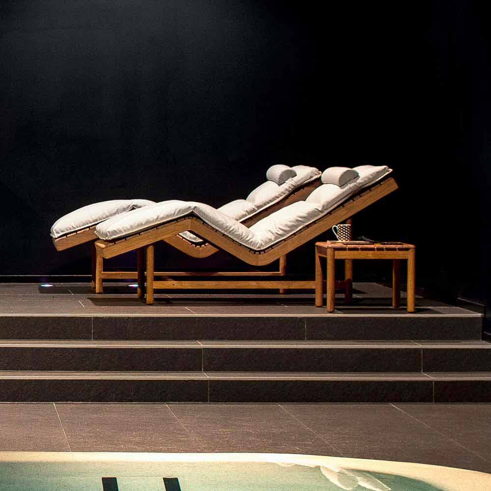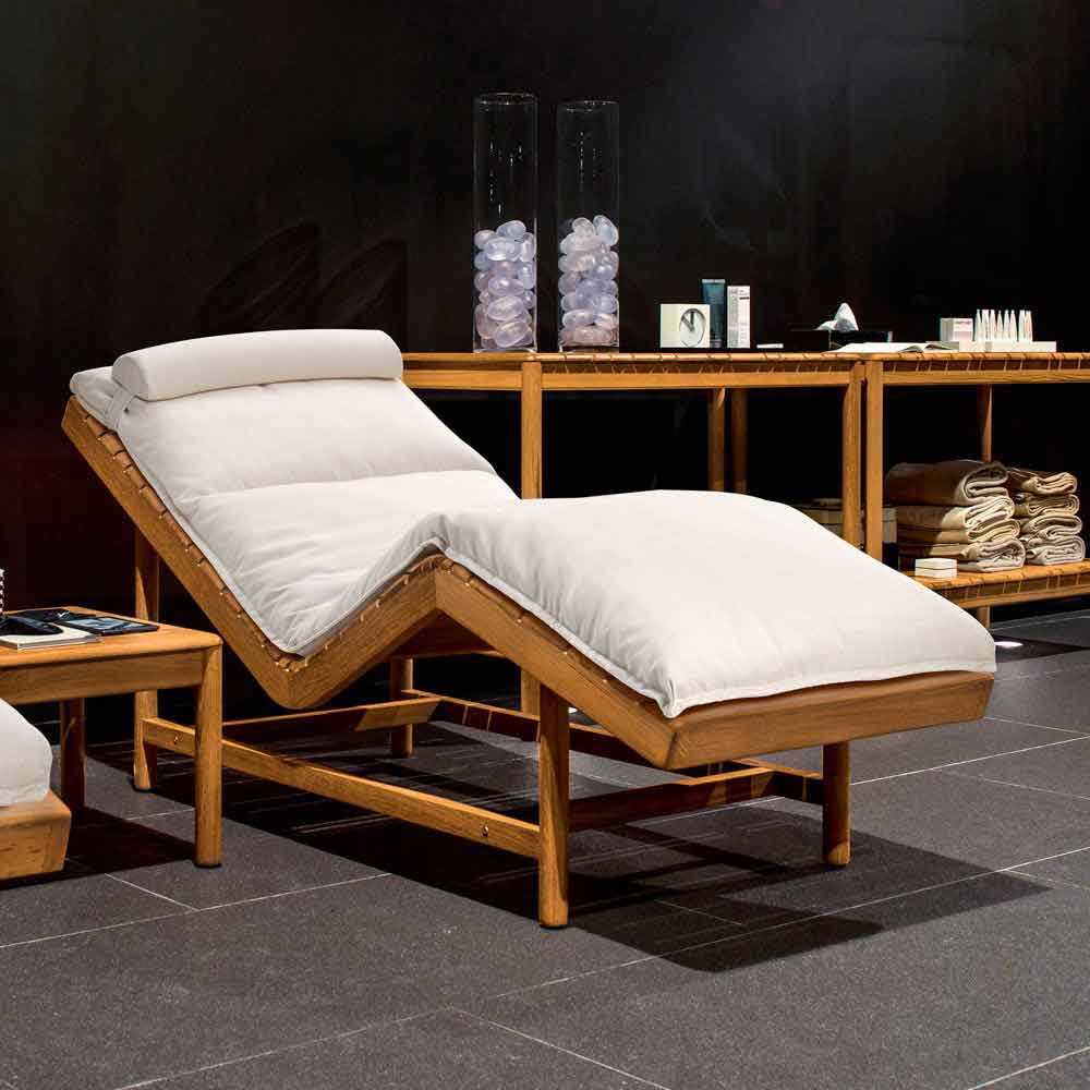 Het Barcode ligbed kan zowel binnen als buiten worden gebruikt en is samengesteld uit een teakhouten structuur met een kussen van 194x70xH8 cm en een hoofdkussen van 60x14xH7 cm (volledig afneembaar).