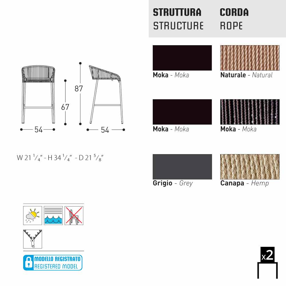 Set bestaande uit 2 hand geweven kunstvezel krukken met frame in gelakt aluminium. De kruk Cricket door Varaschin kan buiten worden gebruikt, maar ook voor indoor omgevingen te leveren.