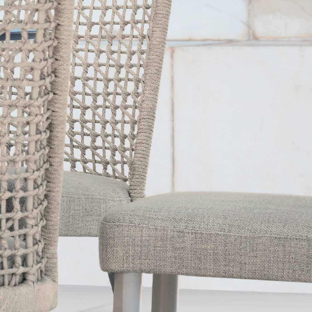 Emma is een buitenstoel die wordt gekenmerkt door een structuur in handgeweven synthetische vezel met een frame van beige gepoedercoat aluminium .