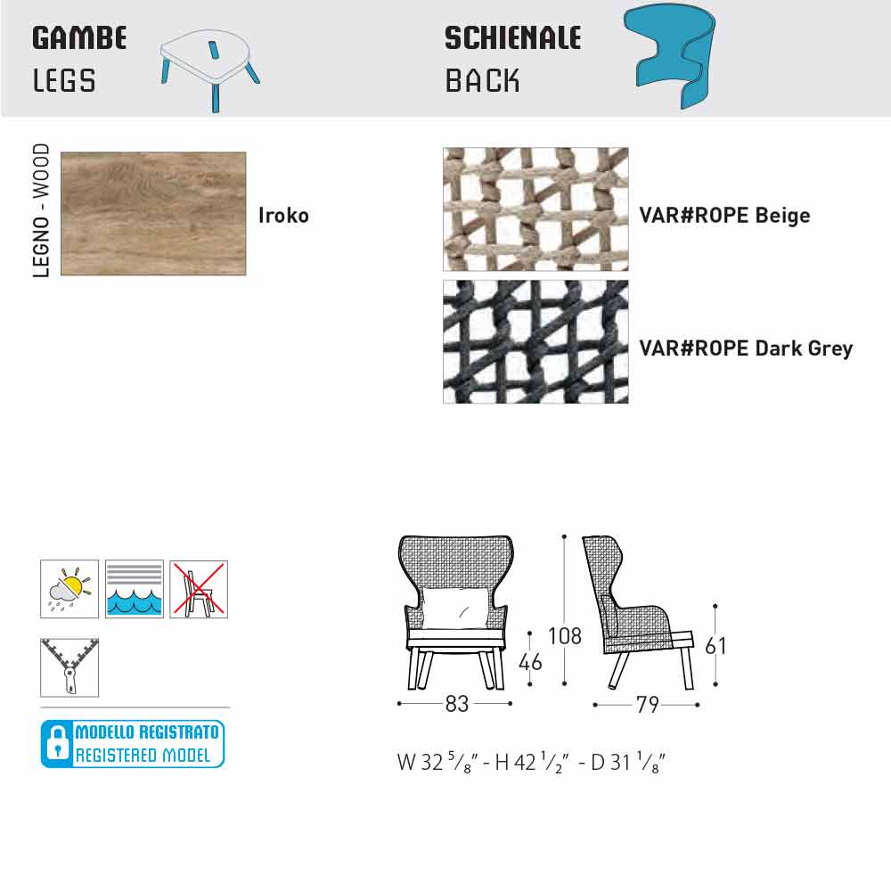 Het komt ook met stevige iroko houten poten en een stoel opgevuld met Dryfeel rubber bedekt met stof.