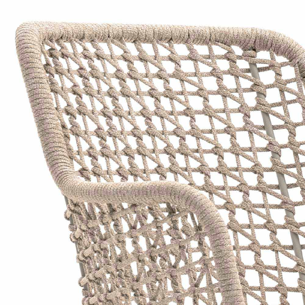 Emma is een buitenzetel die wordt gekenmerkt door een handgeweven synthetische vezelstructuur met een beige , gepoedercoat aluminium frame .