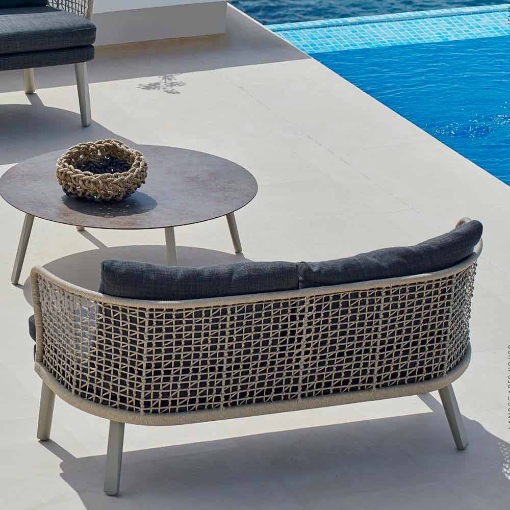 Emma is een heerlijke bank in de buitenlucht die wordt gekenmerkt door een handgeweven synthetische vezelstructuur met een beige , gepoedercoat aluminium frame .