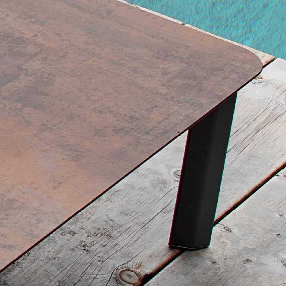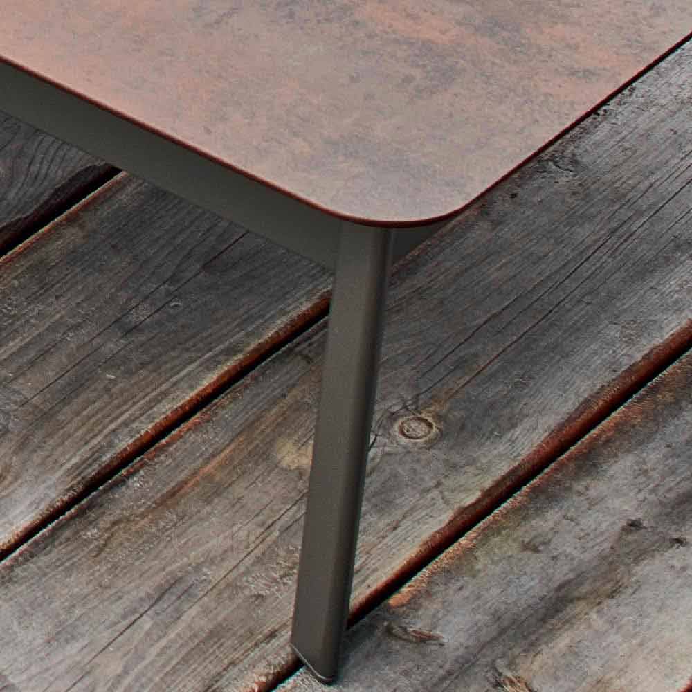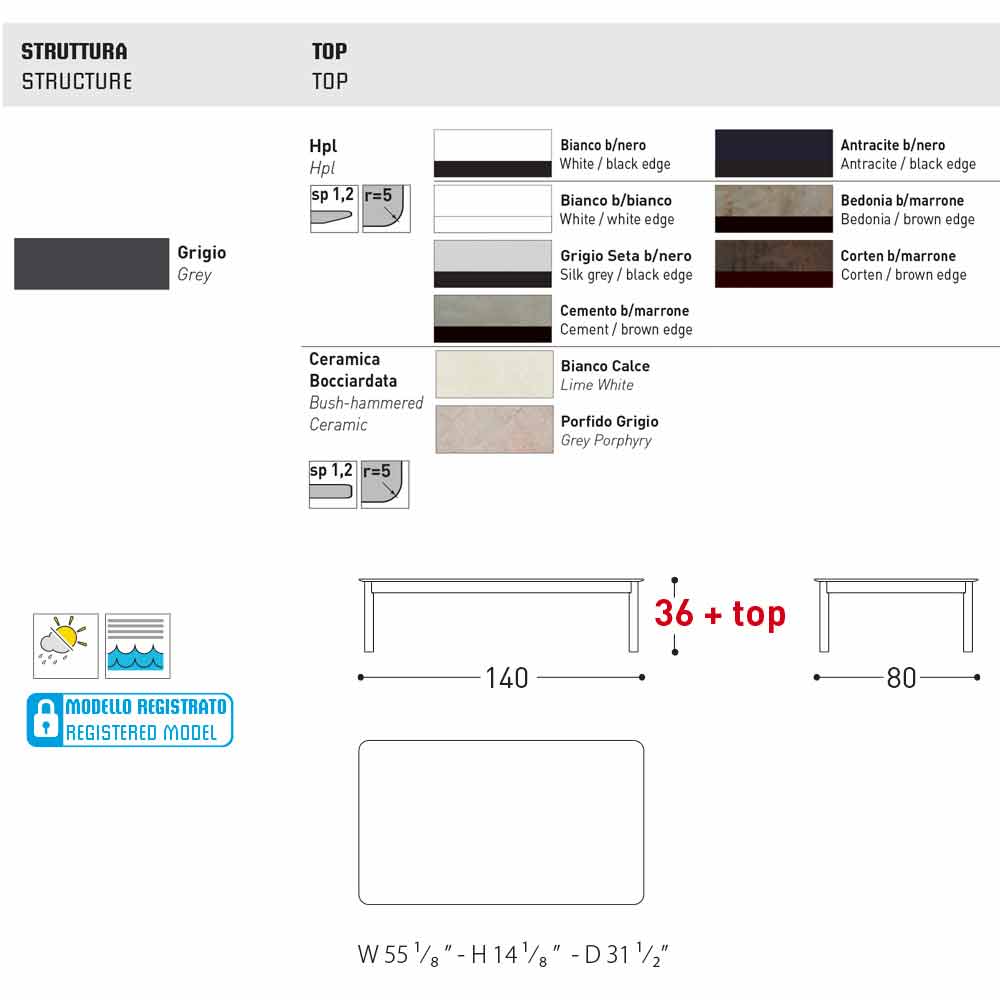 Systeem is een elegante tuintafel met een grijze aluminium structuur met poedercoating ; met top in HPL (sp. 1.2) bij afwerking: setab grijs / zwart, wit b / zwart, antraciet b / zwart, wit b / wit, cement b / bruin, bedonia b / bruin, corten b / bruin ; of met een door een struik gehamerd keramisch blad (sp. 1.2) in de afwerking: wit limoen en grijs porfier .