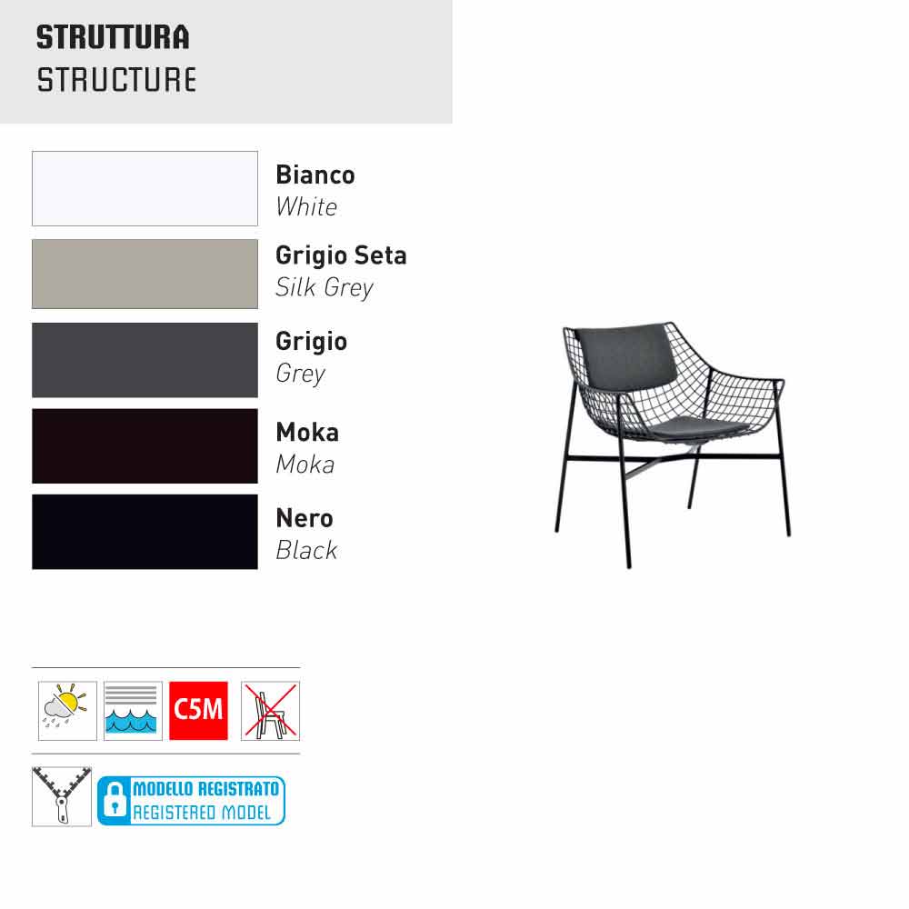 Zout- en chloormist : het product is geschikt voor maritieme omgevingen, bij zoutsproeiomstandigheden en voor meubels aan het zwembad in de aanwezigheid van chloor. Maatregelen: zorgvuldig onderhoud en reiniging zijn essentieel om de integriteit van de componenten zo lang mogelijk te behouden.