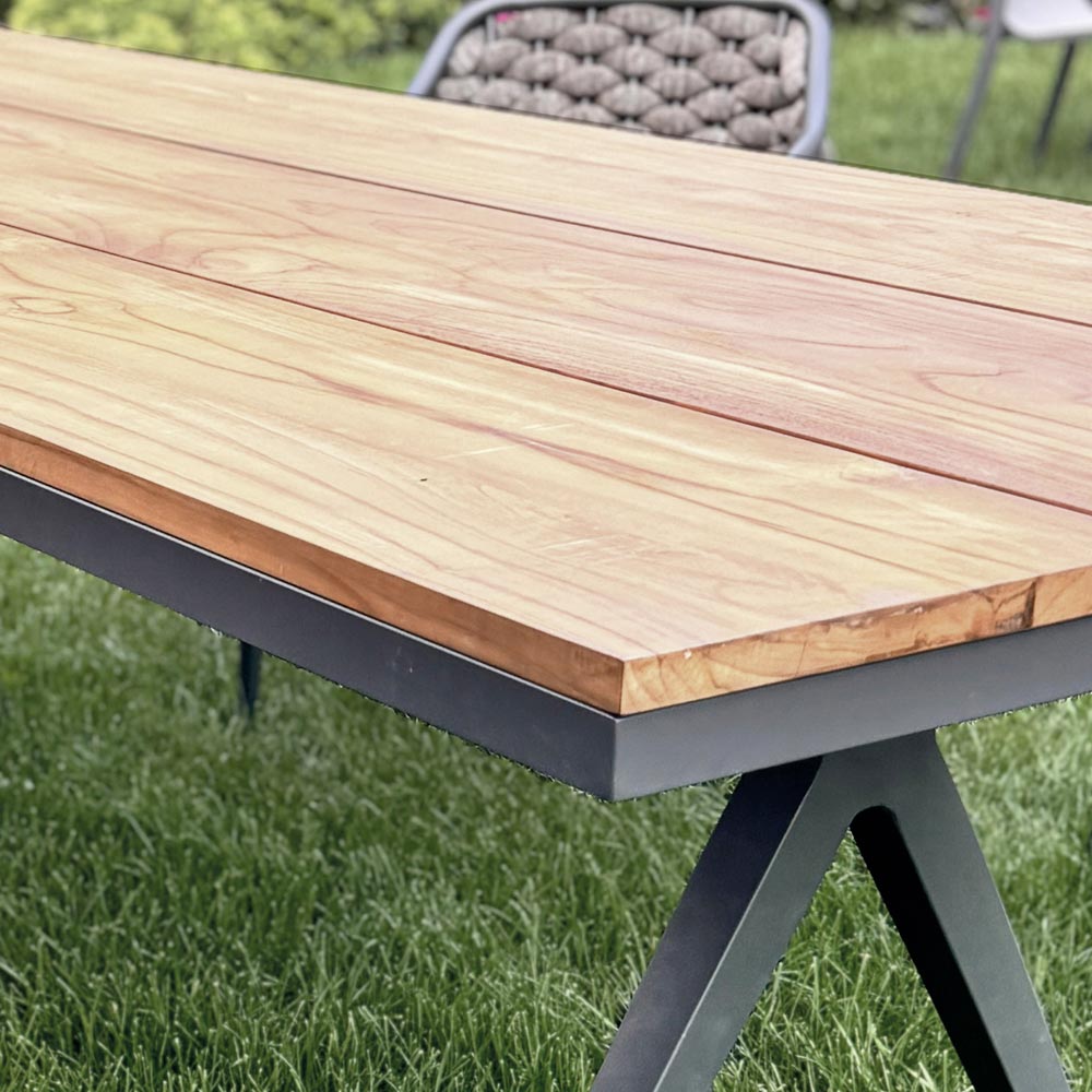 De echte hoofdrolspeler is het blad met massief teakhouten latten , een ambachtelijke keuze die de tafel een tijdloze elegantie geeft. Teakhout, bekend om zijn buitengewone eigenschappen op het gebied van bestendigheid en duurzaamheid , geeft de tafel een warme en uitnodigende uitstraling, perfect voor verfijnde buitenruimtes.