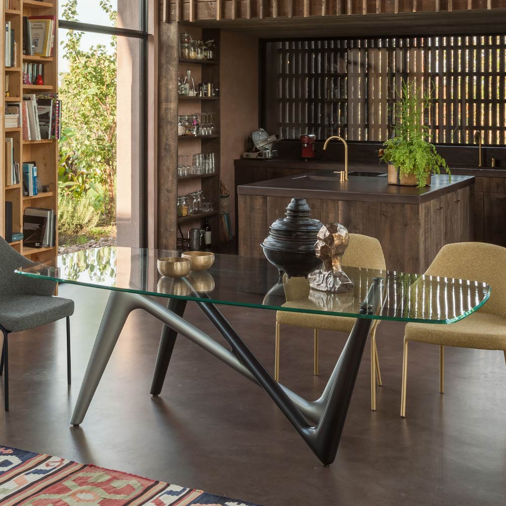 gemaakt in Italië. De tafel, in vaste uitvoering, is een veelzijdige oplossing voor diverse inrichtingsstijlen. Met het glazen blad in combinatie met de geverfde basis helpt het om het karakter van het huis te definiëren. Verkrijgbaar in twee verschillende bladmaten om beter aan de ruimtebehoeften te voldoen. De tafelstructuur omvat poten van geverfd hard polyurethaan en het tonvormige blad is gemaakt van extra helder transparant gehard glas met een afgeschuinde rand, waardoor u de keuze heeft tussen een moderne en elegante uitstraling of een meer traditionele en robuuste uitstraling.