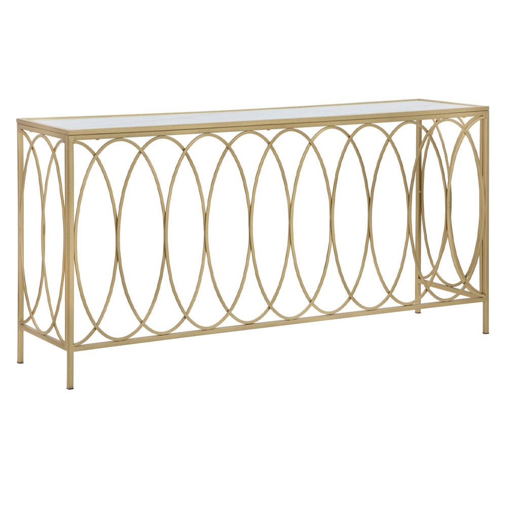Vaste toegangsconsole in goudkleurig ijzer met een glazen blad met wit marmereffect.