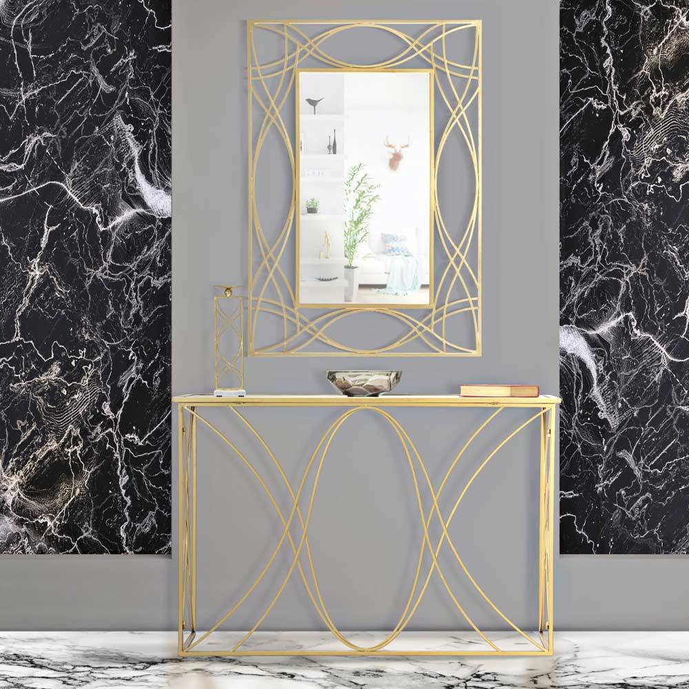 Vaste toegangsconsole met structuur gemaakt van goudkleurig ijzer met spiegelblad . Een eenvoudig en boeiend ontwerp dat uniek en exclusief is gemaakt dankzij de bijzondere basis die kronkelige lijnen en geometrische vormen gebruikt om de esthetiek van het product te verrijken en een vleugje persoonlijkheid te geven . Het resultaat is een verfijnde en avant-gardistische console die zich dankzij zijn veelzijdigheid en zijn eigentijdse karakter aan elke moderne stilistische situatie kan aanpassen.