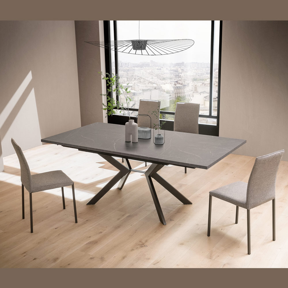 De voet, van geverfd metaal en met een gekruist geometrisch ontwerp, biedt stabiliteit en een sculpturale touch die niet onopgemerkt blijft. Een perfecte meubeloplossing voor eetkamers, open ruimtes of zakelijke omgevingen met een verfijnde stijl.