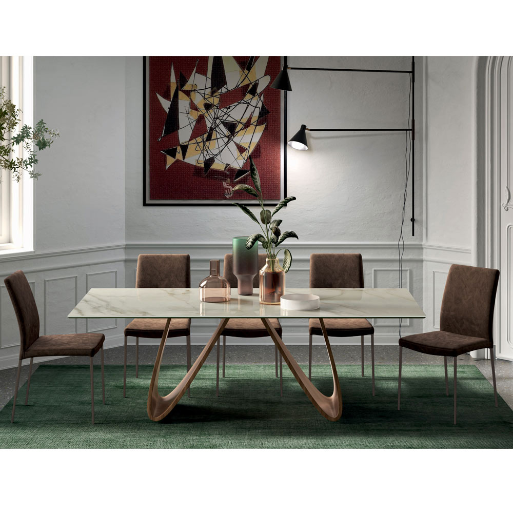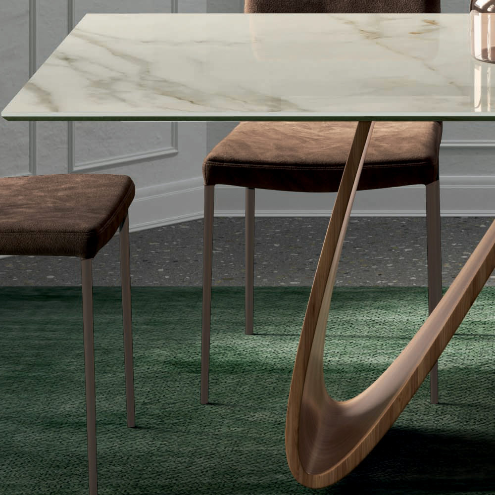 Dankzij de vorm van het onderstel en de beschikbare bladafwerkingen is de tafel in staat om een