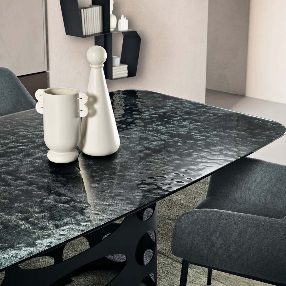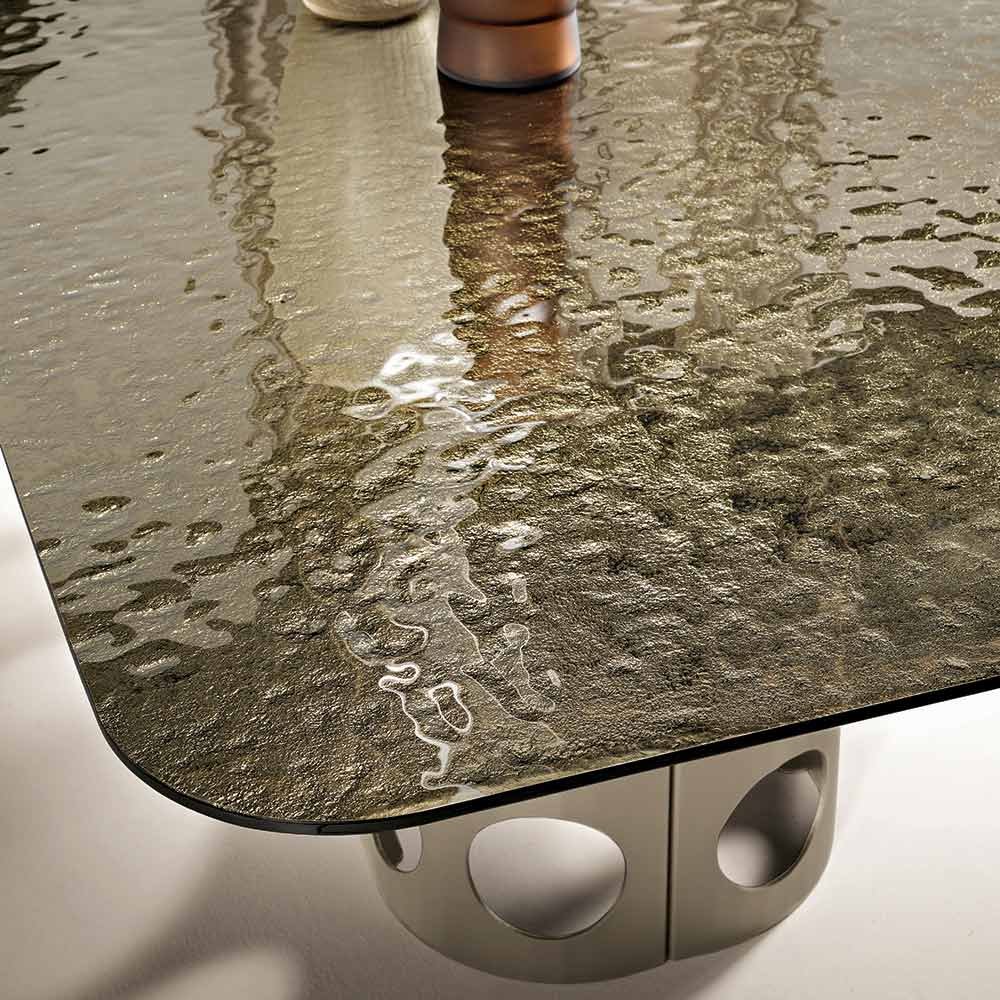 Het gehamerde glazen tafelblad geeft de tafel diepte en karakter dankzij de unieke textuur die het licht op een onregelmatige manier weerkaatst en zo opvallende visuele effecten creëert. Dit proces maakt elk oppervlak dynamisch en verfijnd, wat het eigentijdse ontwerp van het product versterkt.
