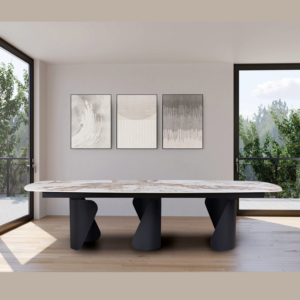 De structuur onderscheidt zich door de basis, bestaande uit drie sculpturale metalen poten met een geometrisch en dynamisch design en een verfijnde zwarte afwerking. Deze poten bieden niet alleen uitstekende stabiliteit , maar vormen ook een decoratief element met een eigentijdse en exclusieve esthetiek.