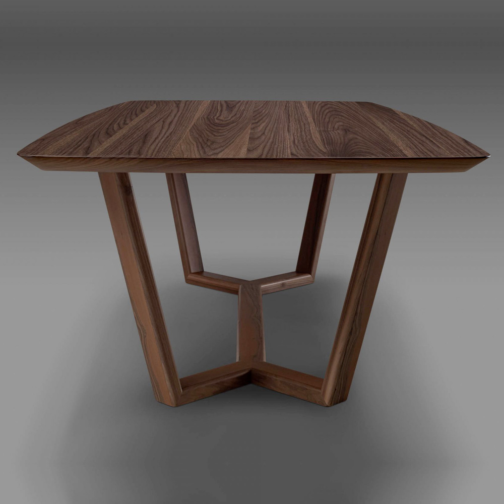 Vaste tafel met gevormd en afgeschuind blad op Canaletto walnoot gefineerde meubelplaat en massief houten onderstel.