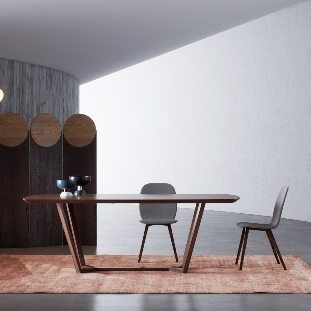 De tafel wordt gevormd door futuristische vormen, die de essentie licht geven en onderscheidende lijnen en perspectieven geven. De robuustheid van de materialen vertaalt zich in een creatieve impuls gesmeed door bekwame Italiaanse handen, waardoor nieuwe kwalitatieve en esthetische doelen worden bereikt. Meubels worden een middel om de ideale persoonlijke ruimte te realiseren.