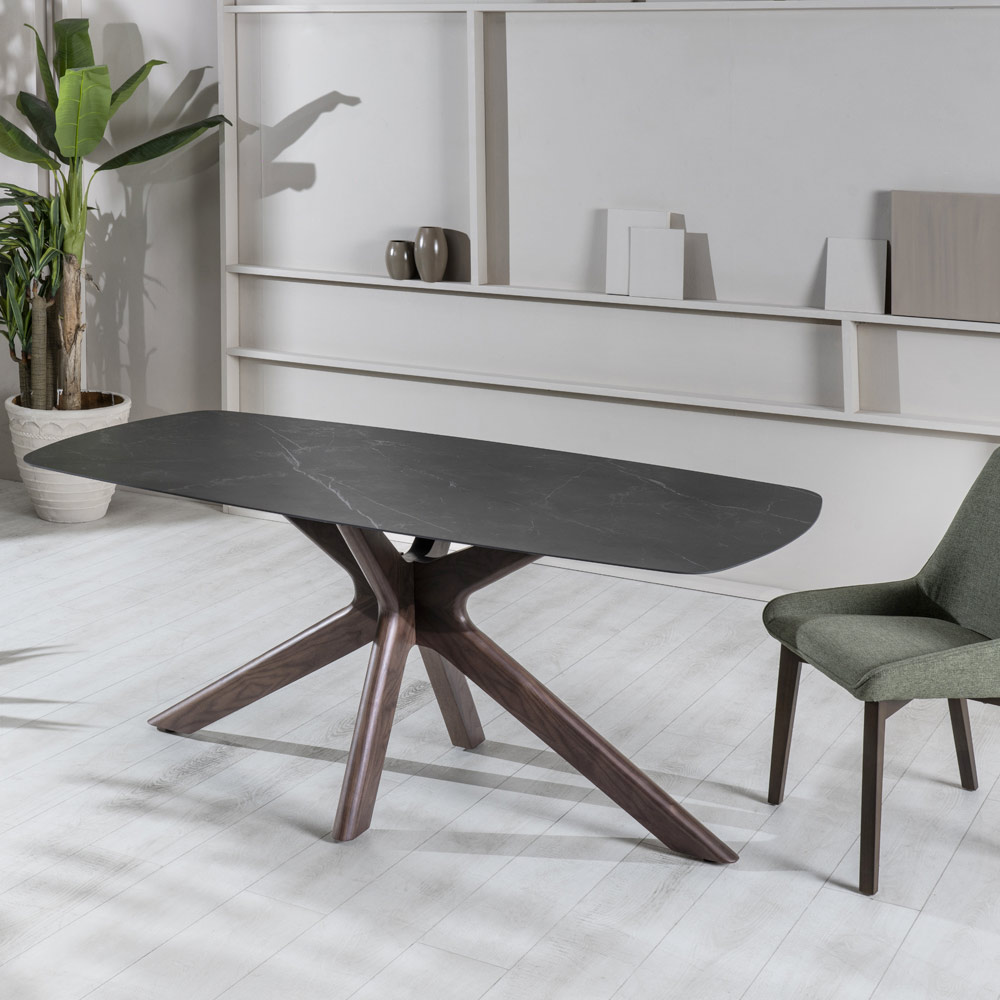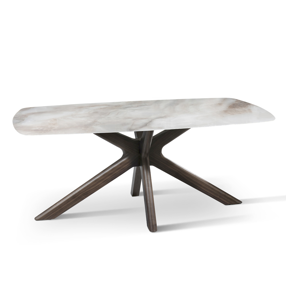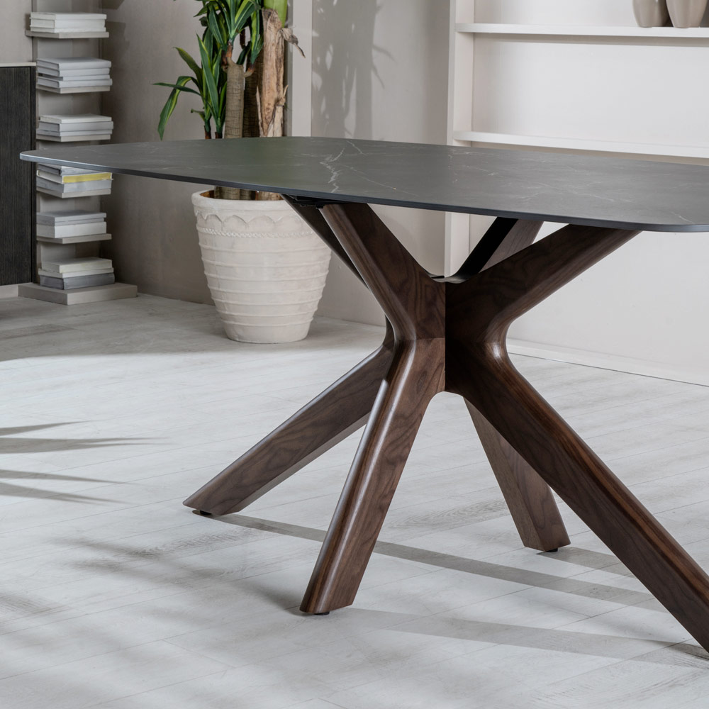 Het is een verfijnde en originele tafel, waarin vloeiende en zachte lijnen met elkaar spelen, waardoor details met een grote visuele kracht ontstaan. Het keramische blad rust subtiel op het stervormige onderstel, gemaakt van massief notenhout. Het resultaat van onderzoek dat de meest uiteenlopende stijlen en inspiraties onderzoekt, is een echte protagonist van de woonruimte, die harmonieus past in zowel omgevingen met een modern design als in ruimtes die de voorkeur geven aan luxe en klassieke stijl.
