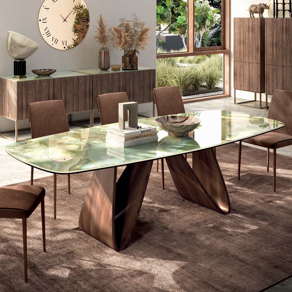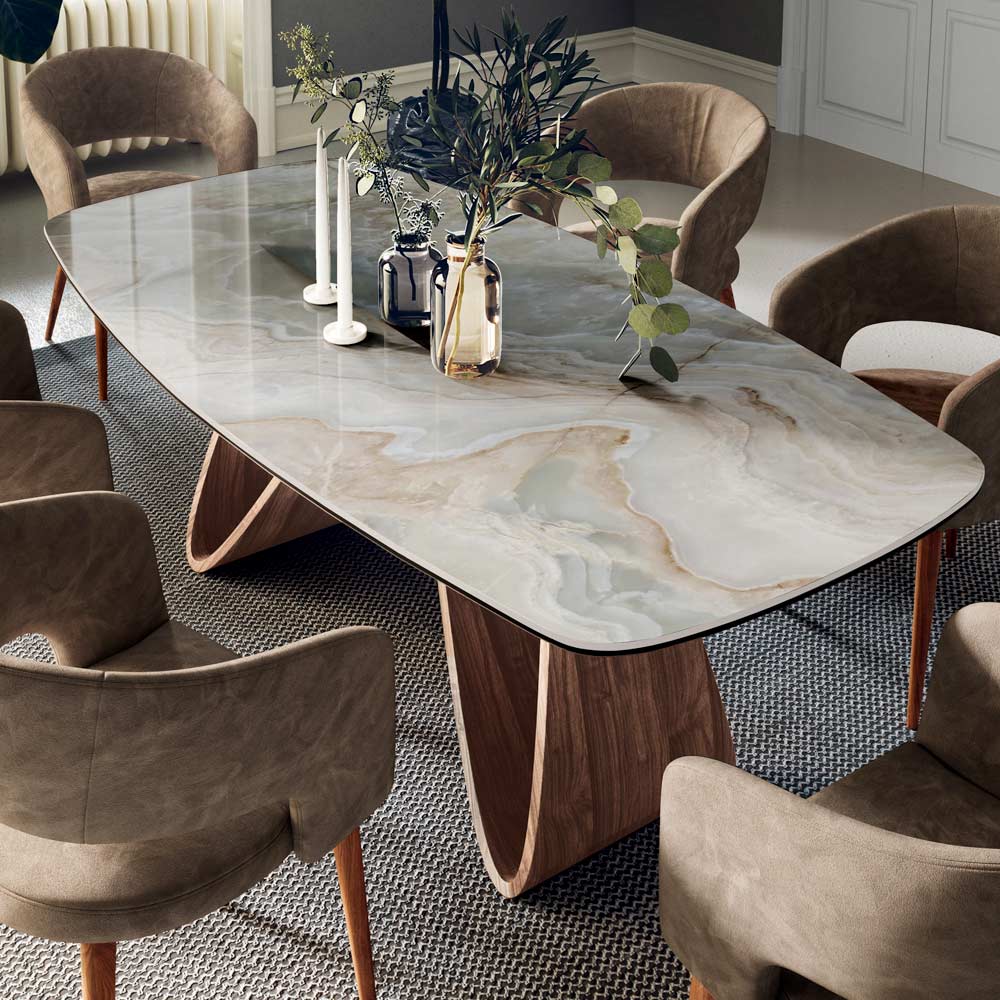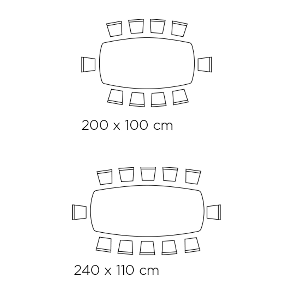 Dankzij de vorm van het onderstel en de beschikbare bladafwerkingen is de tafel in staat om een
